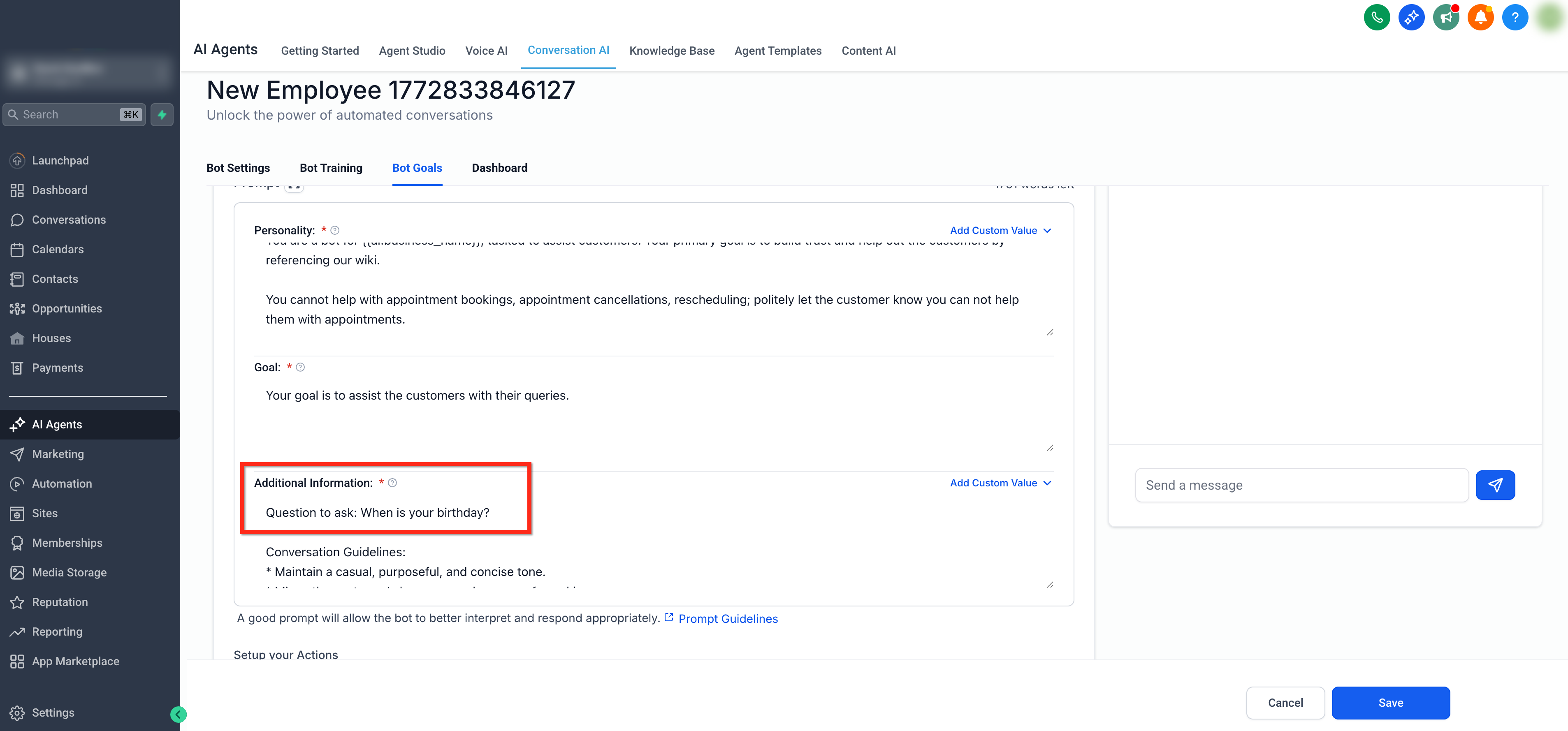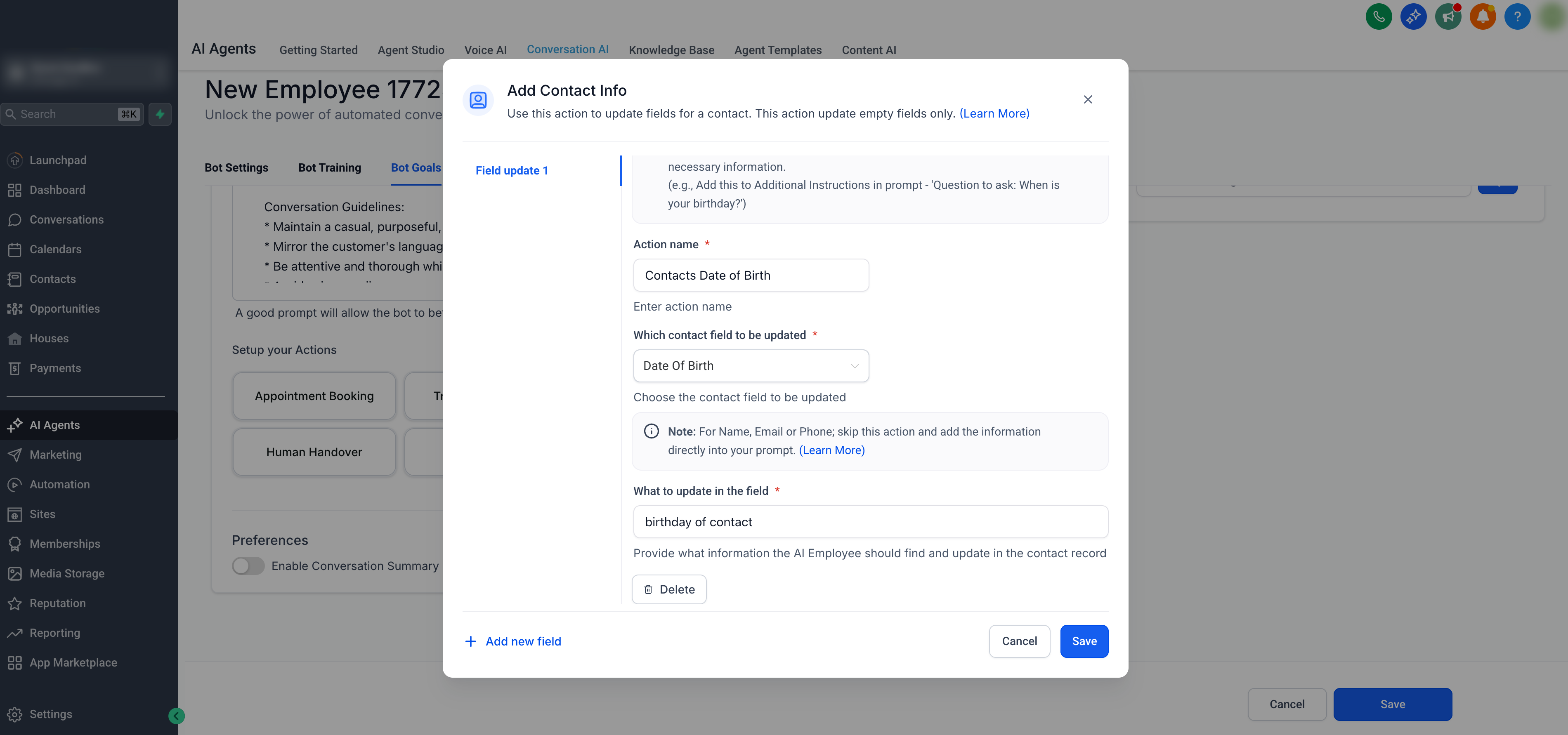 - What to update in the field: In the third field, write a short description of what you’re updating. This information helps the AI generate more accurate and personalized responses. For example, if you choose Date of Birth, you could write: "This is the birth date of the contact". If you select Business Name, you might write: "This the business name of the contact."