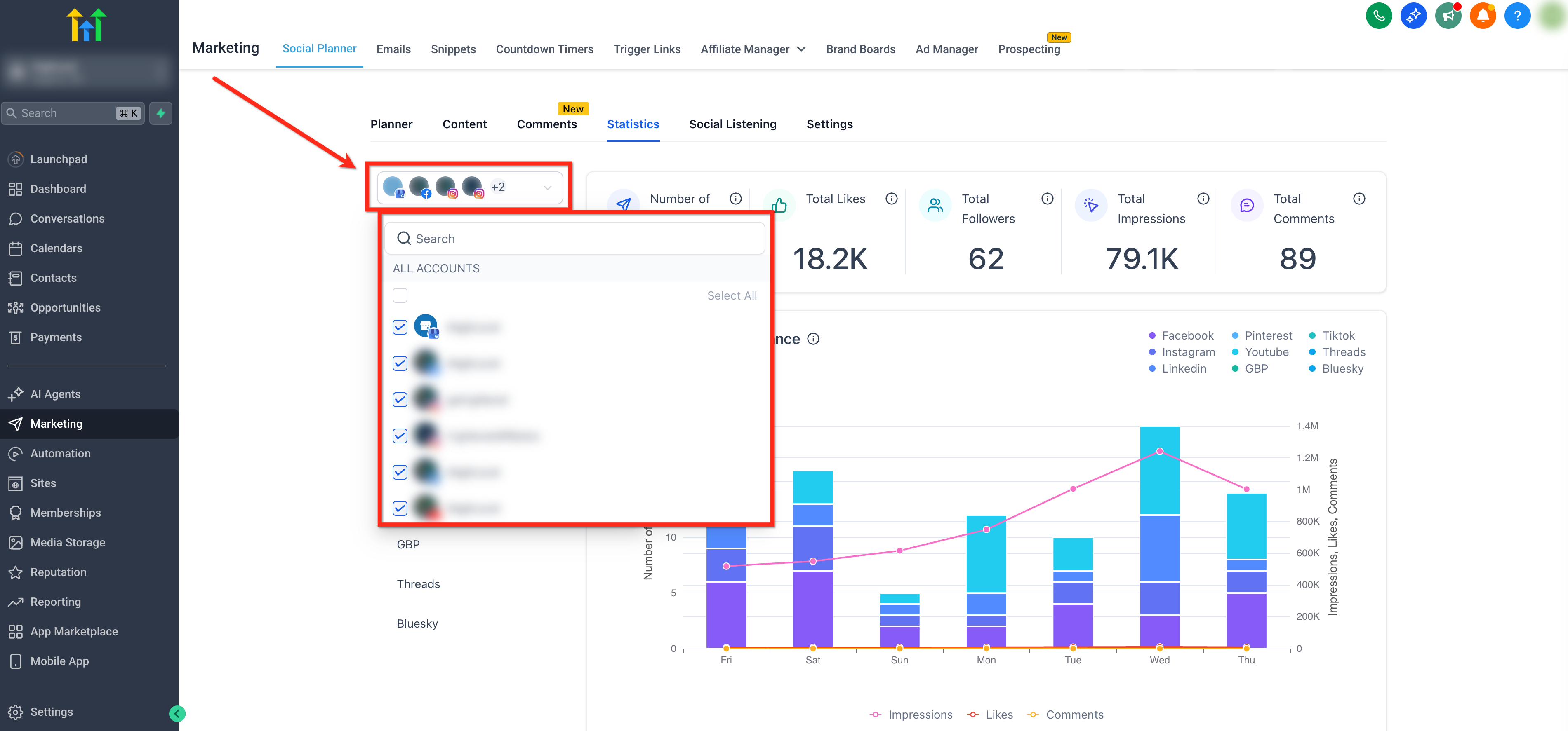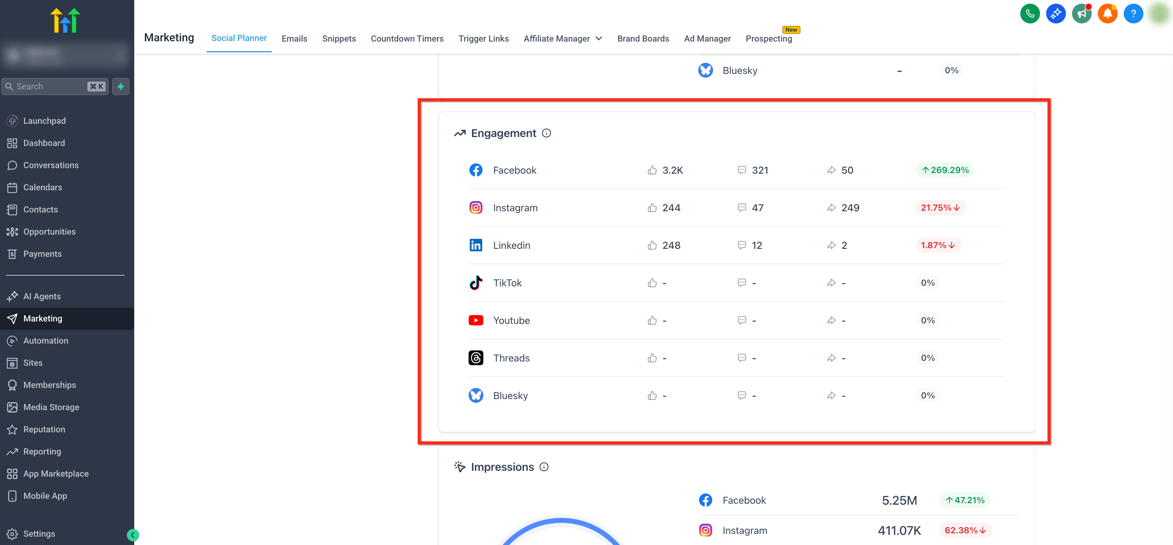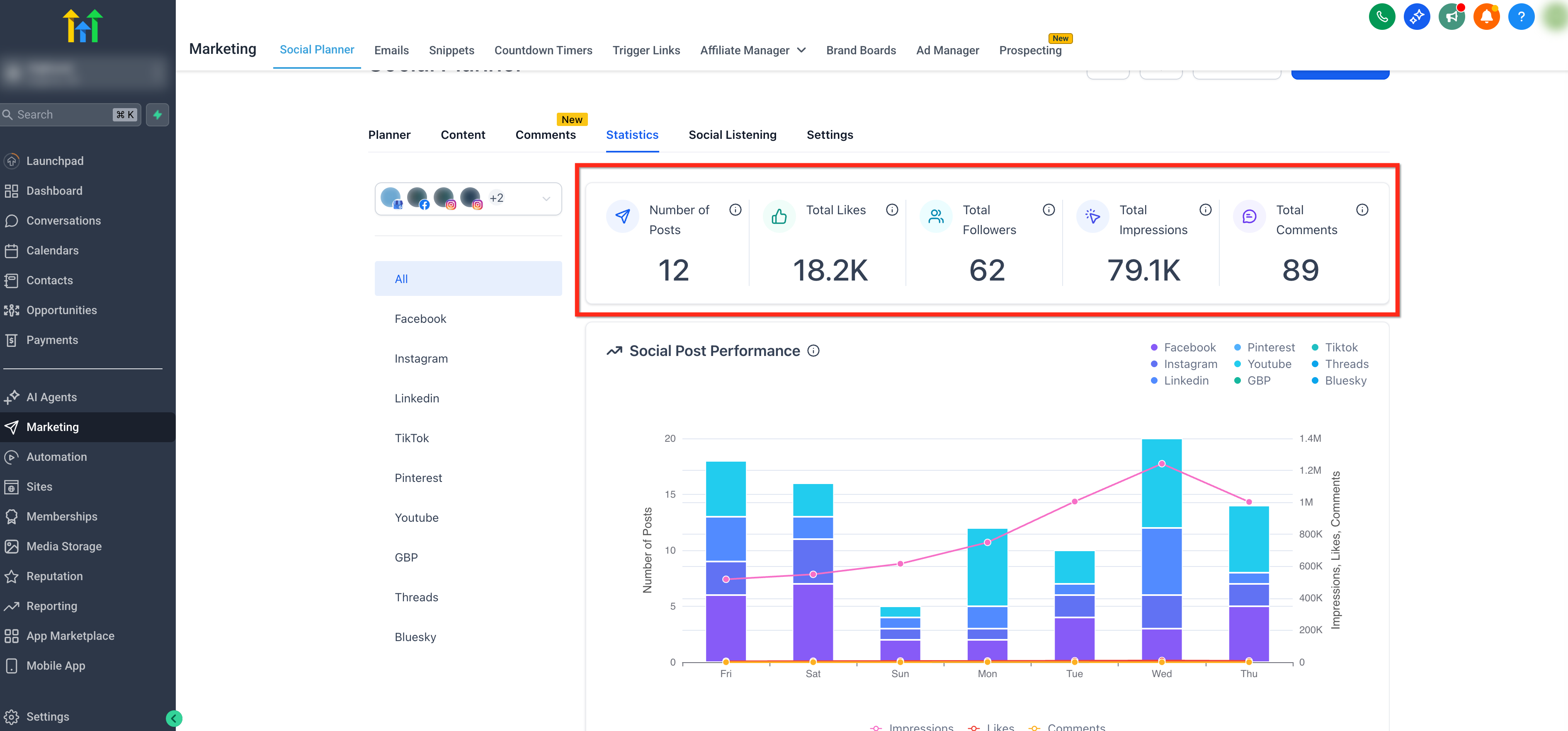 Advanced Analytics in HighLevel’s Social Planner provide a consolidated view of your social performance across platforms so you can evaluate posting volume, visibility, and engagement in one place. Use these insights to identify what content performs best, compare platforms side by side, and refine your strategy with confidence.