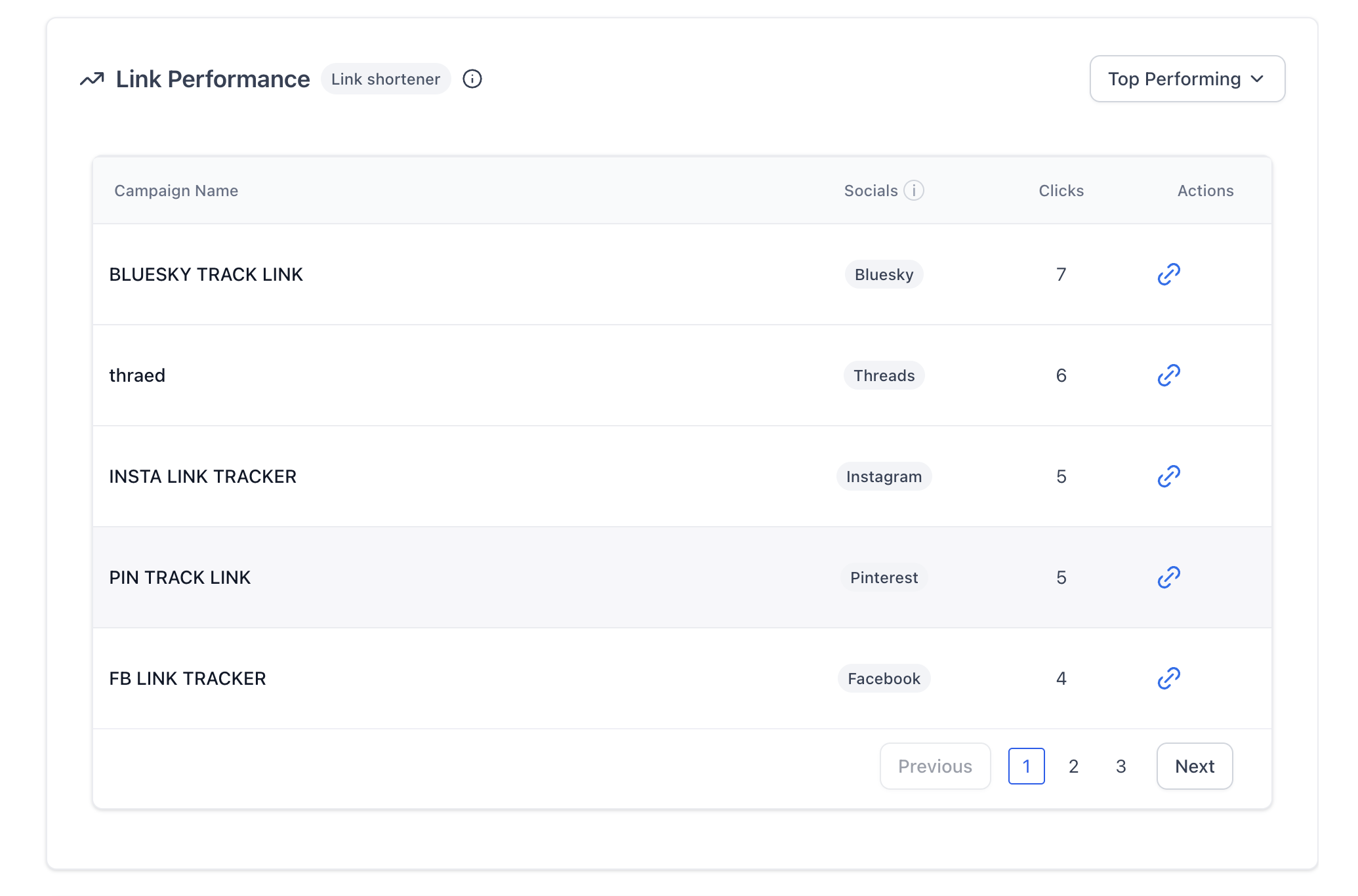 Track the performance of your shortened links across all social platforms, including total clicks per link belonging to a campaign.