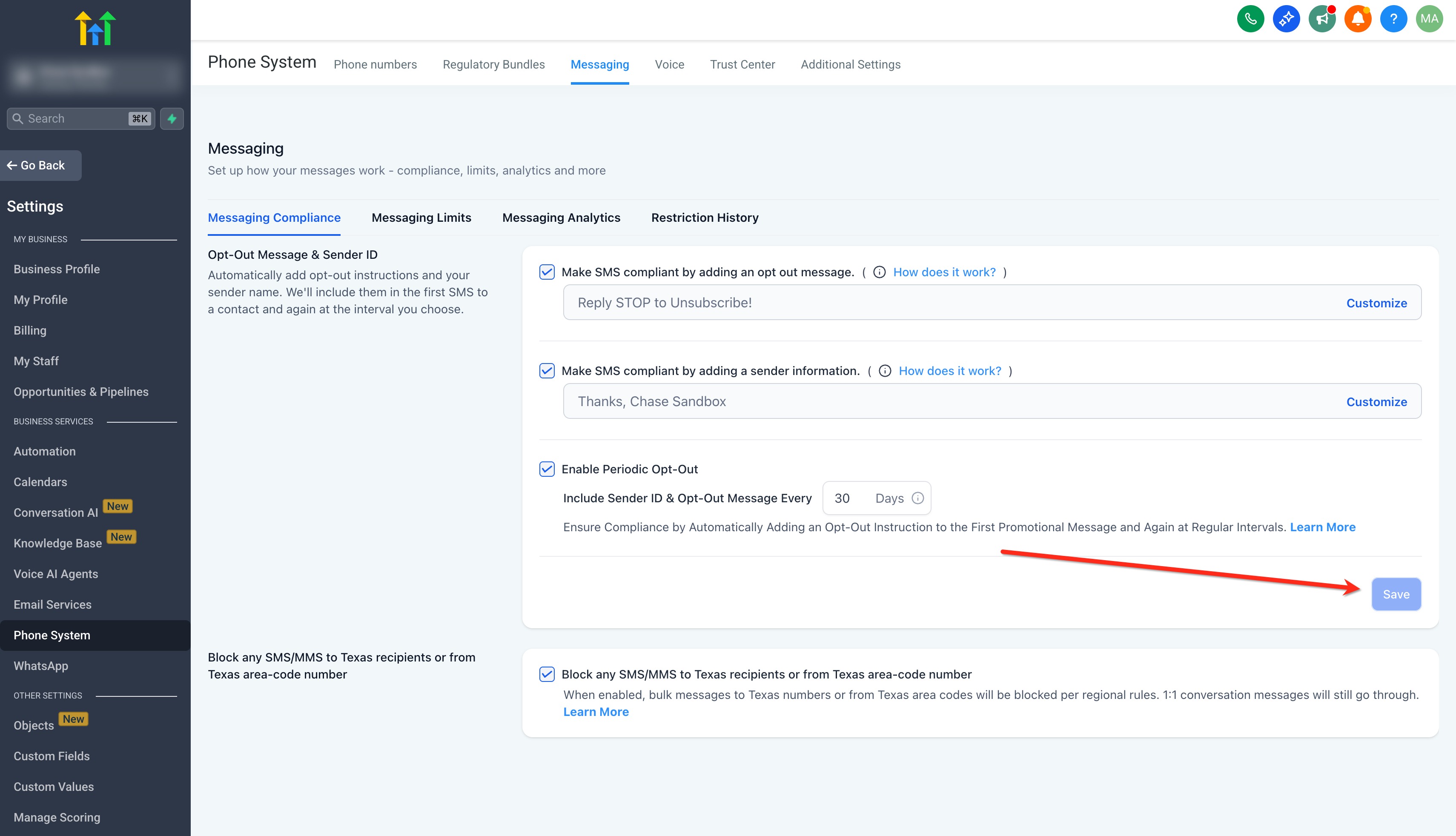 If you’re in trial mode, managing a location less than 15 days old, or have restricted user permissions, you may not be able to disable these options. HighLevel recommends keeping them enabled to maintain compliance.