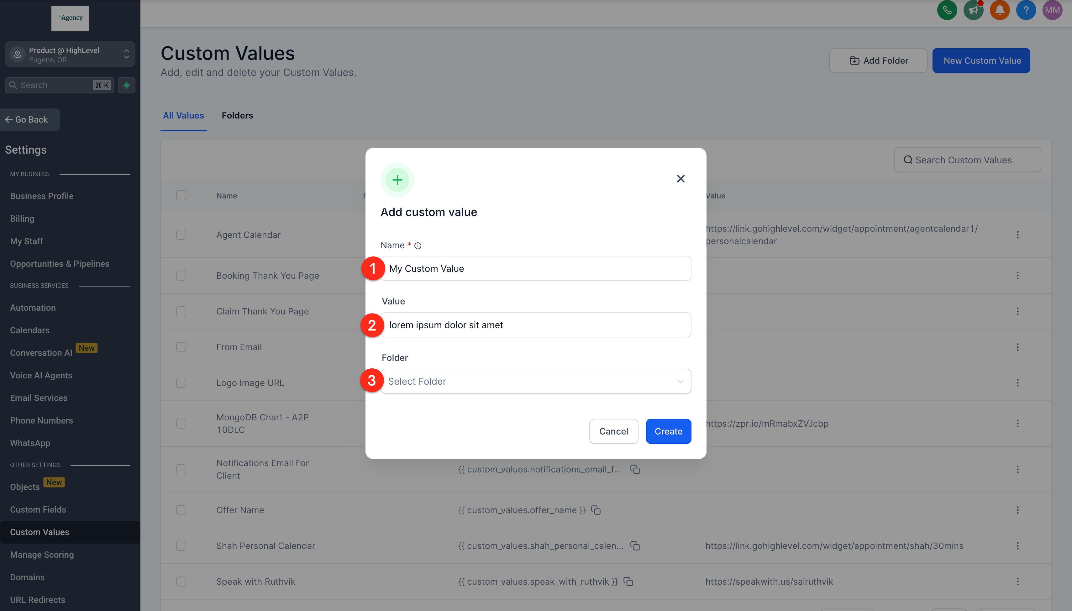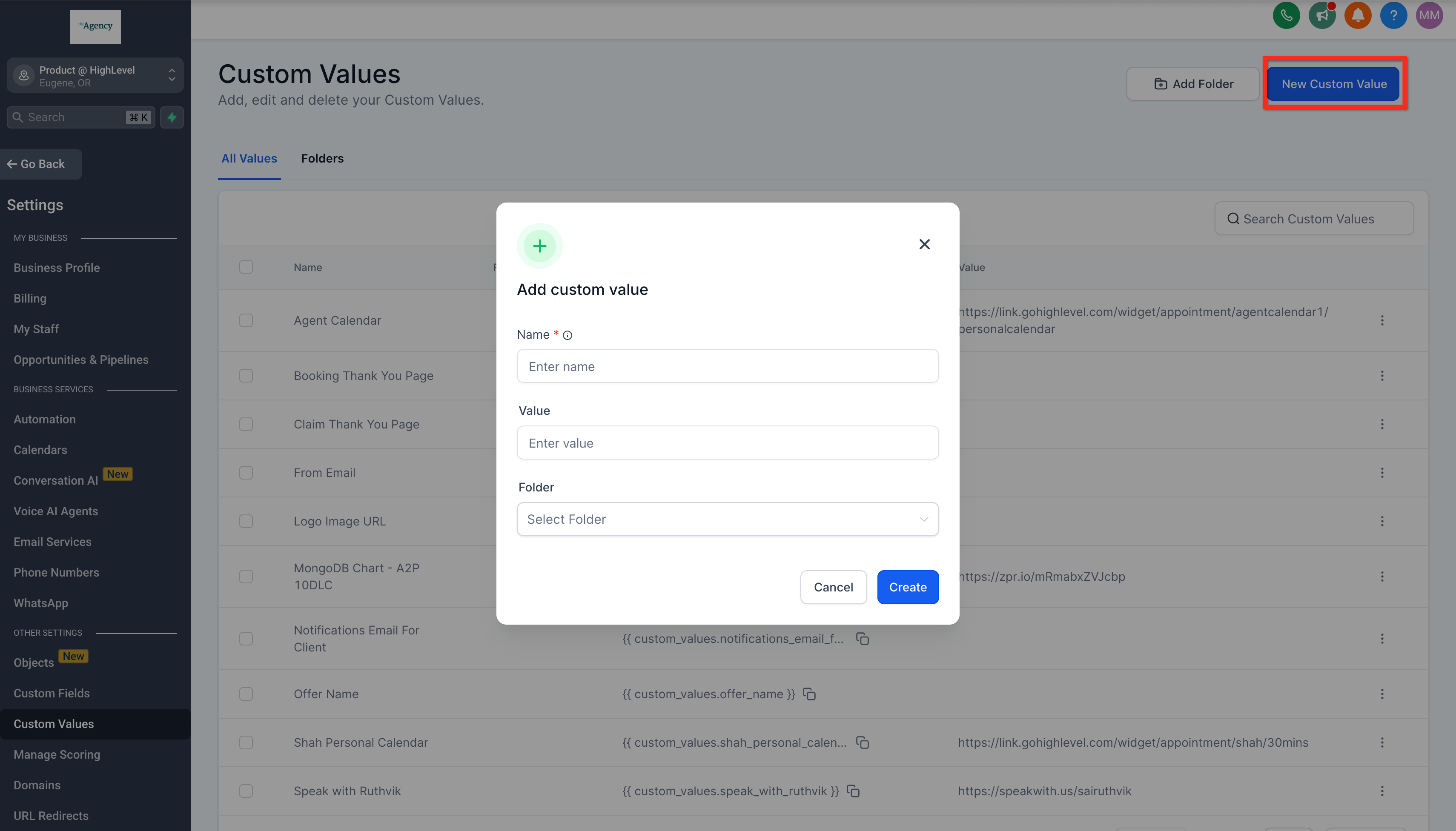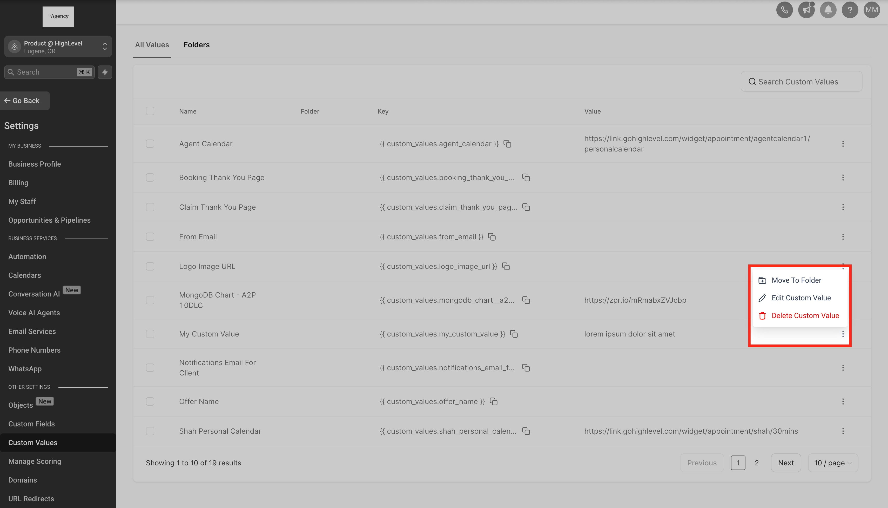 Custom Values are key:value pairs that can be created once and reused throughout the platform.