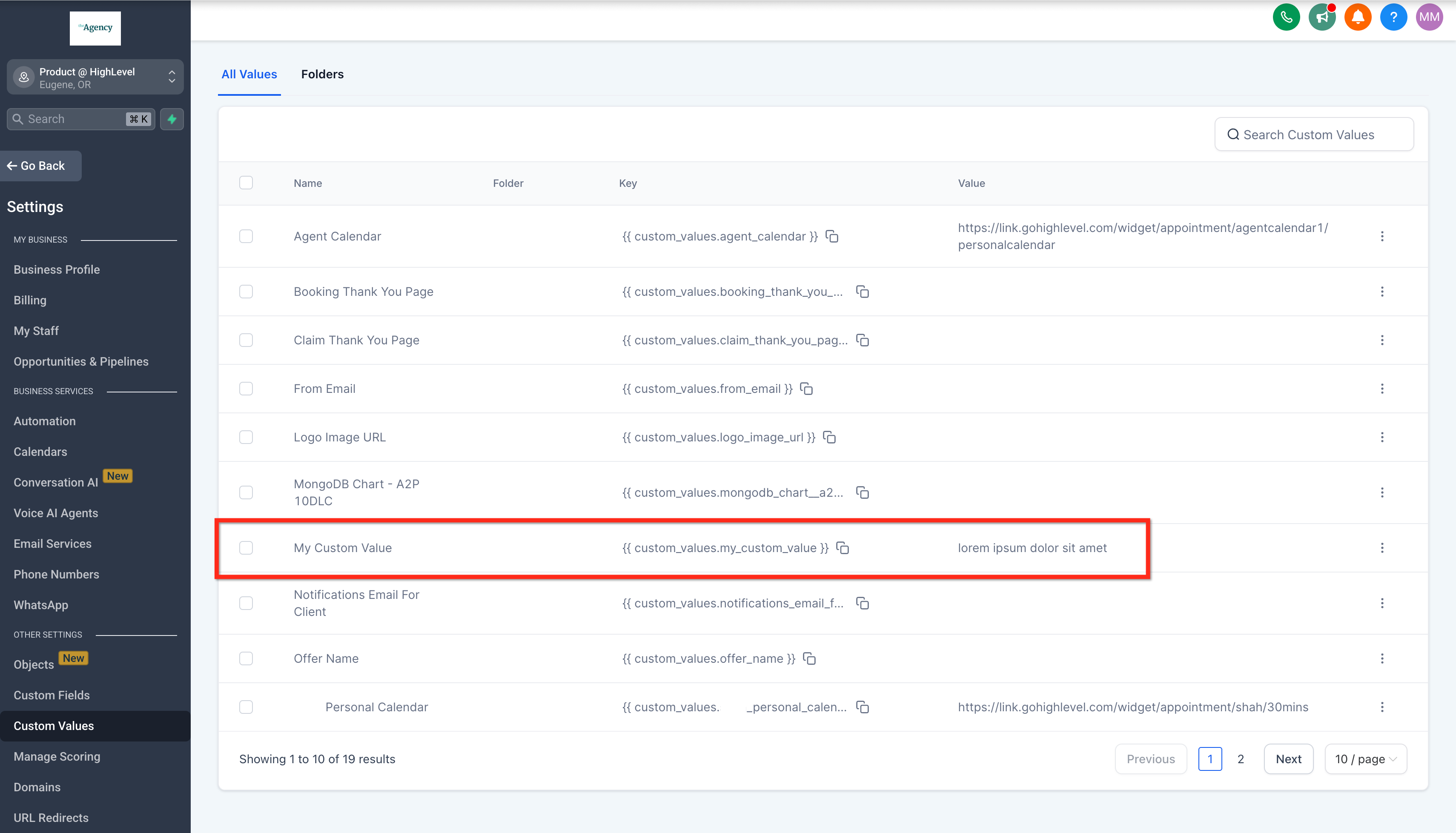 The Custom Value function is a Key and a Value that can be accessed anywhere in the platform. Instead of writing the same value over and over again in many places, you can write the Key everywhere. Then, if you change the one Value in the Custom Values list, the Key will be updated everywhere automatically.