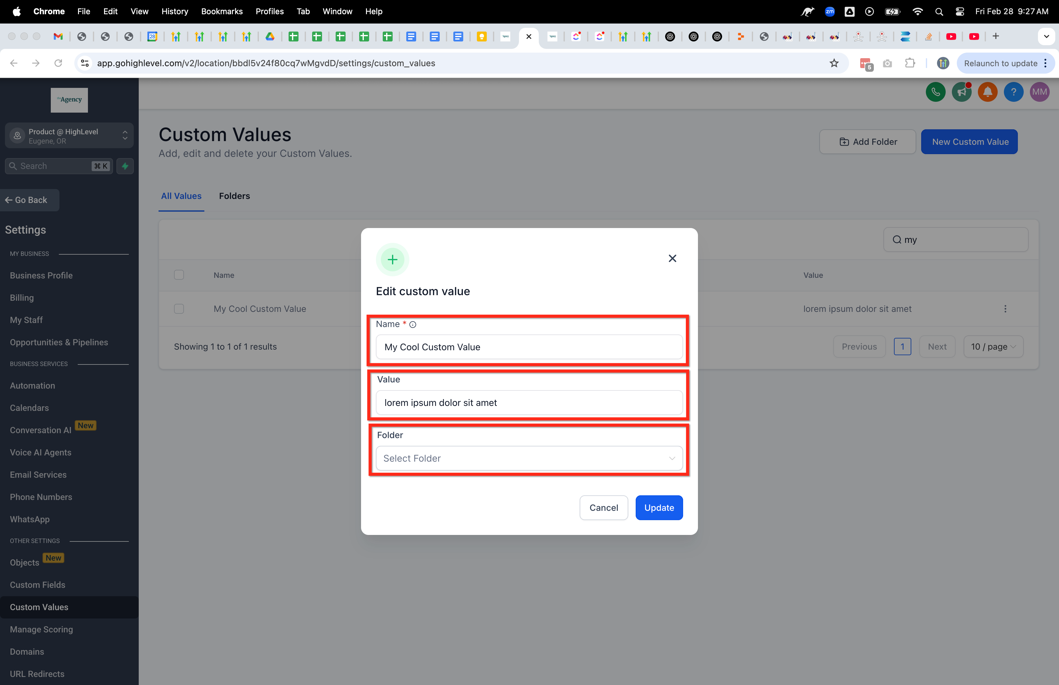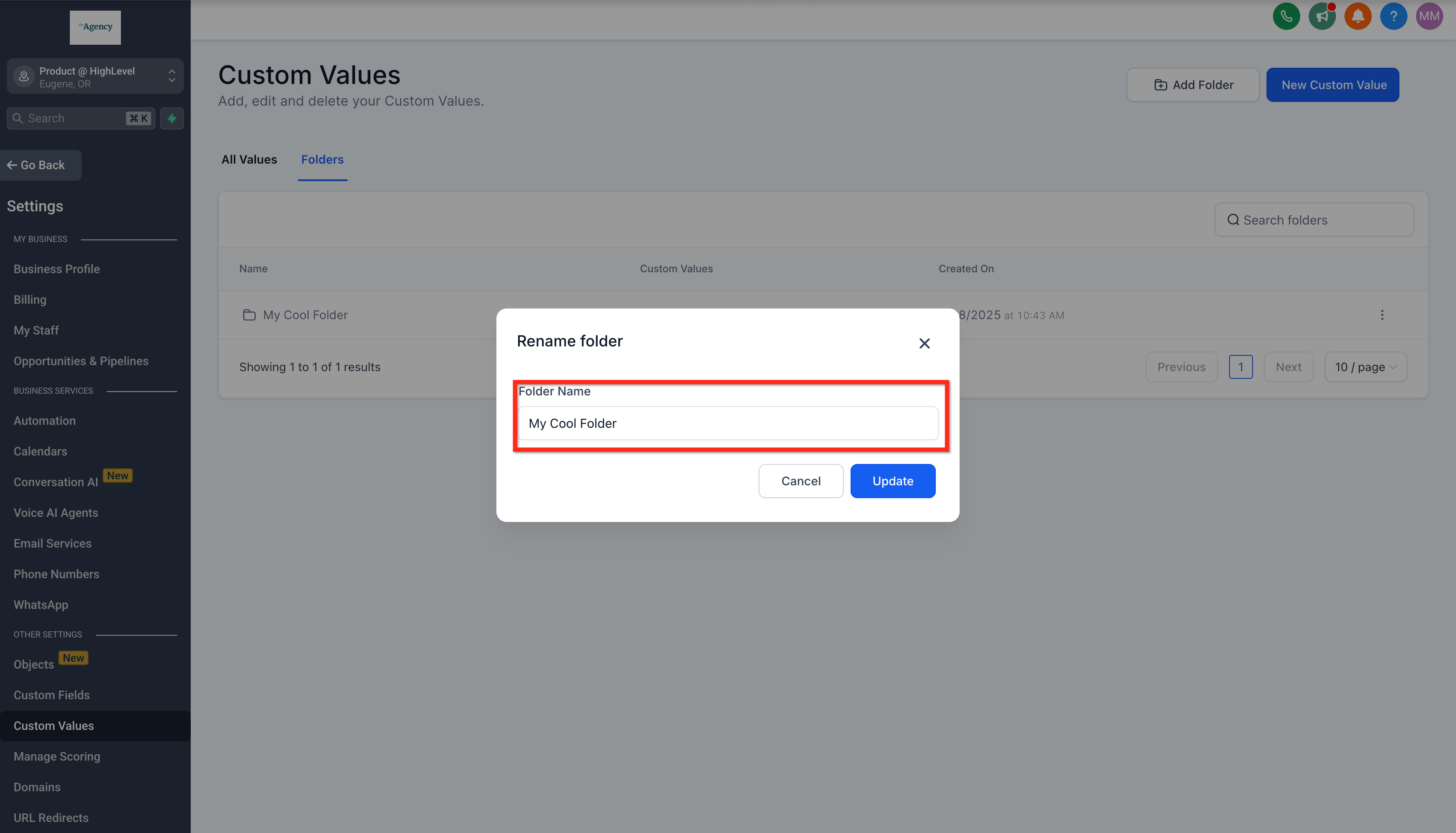 Click Edit Custom Value. In the modal, you can fill in a new Name, new Value, and/or move it to a new folder. Remember that changing the Name will not change the Key.