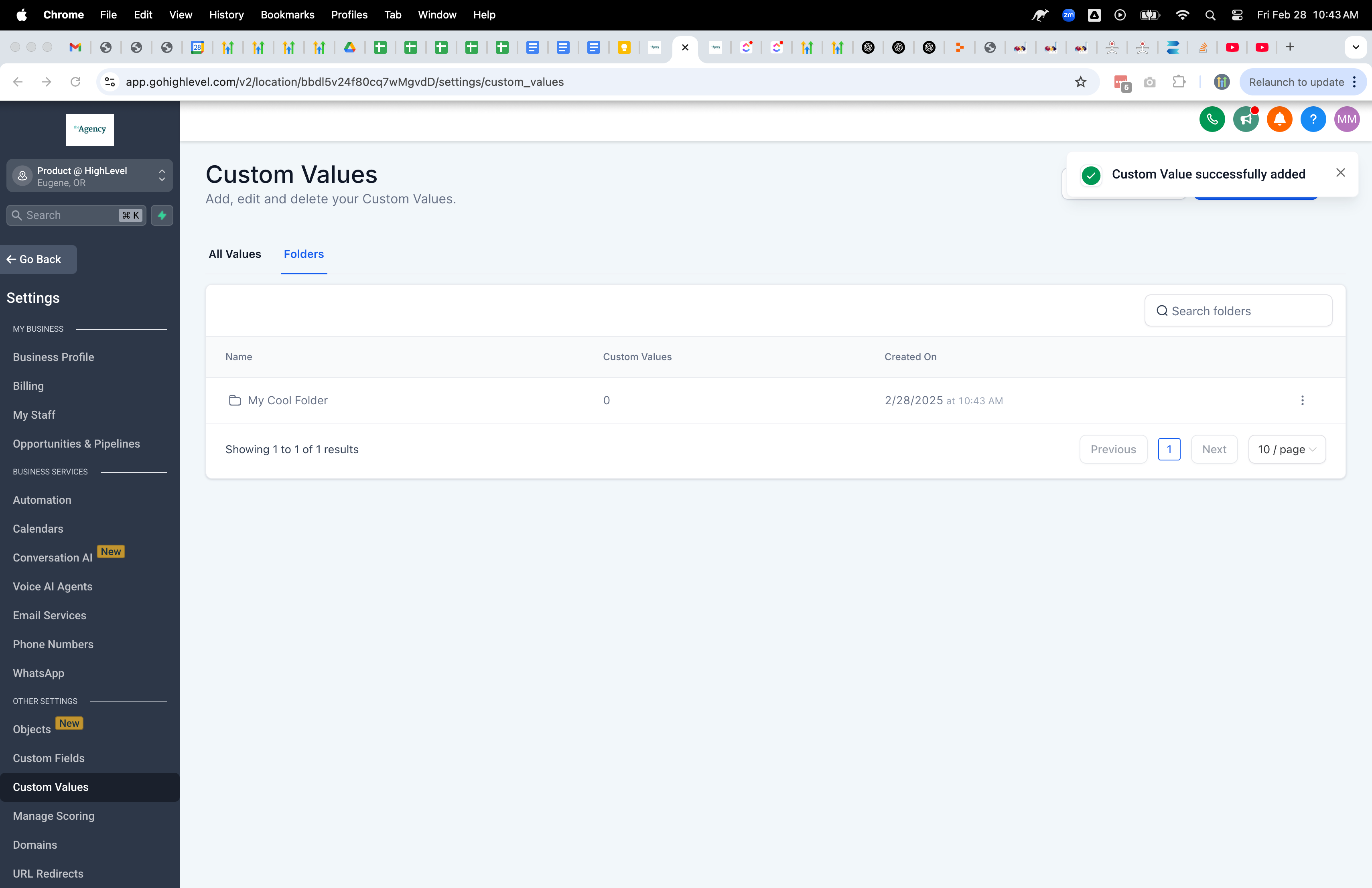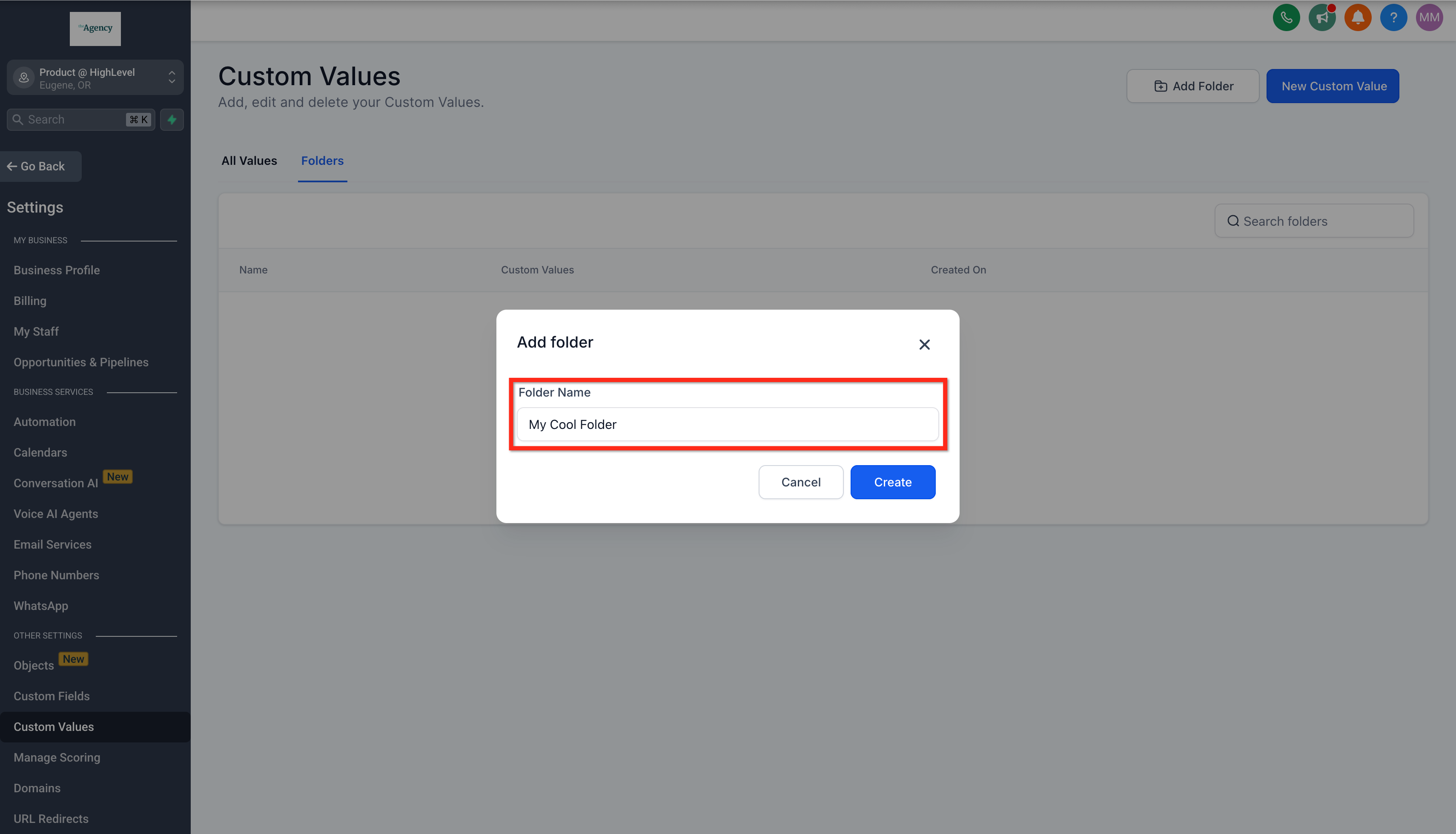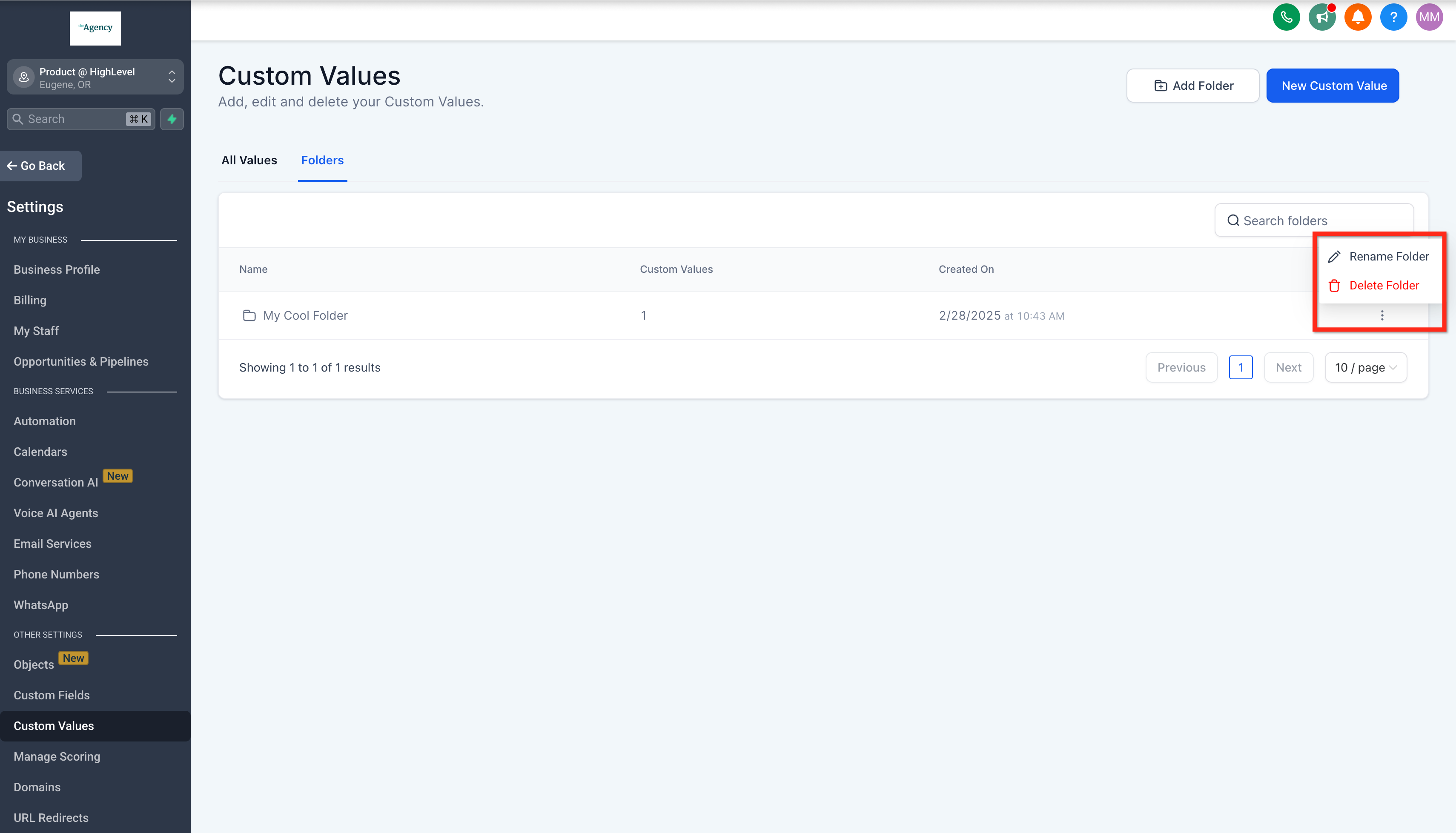 Click on the Folders tab and then the Add New Custom Value Folder button. Folders with Custom Values in them will appear in the All Values list > Folder column. All folders will be listed in the Folders list.