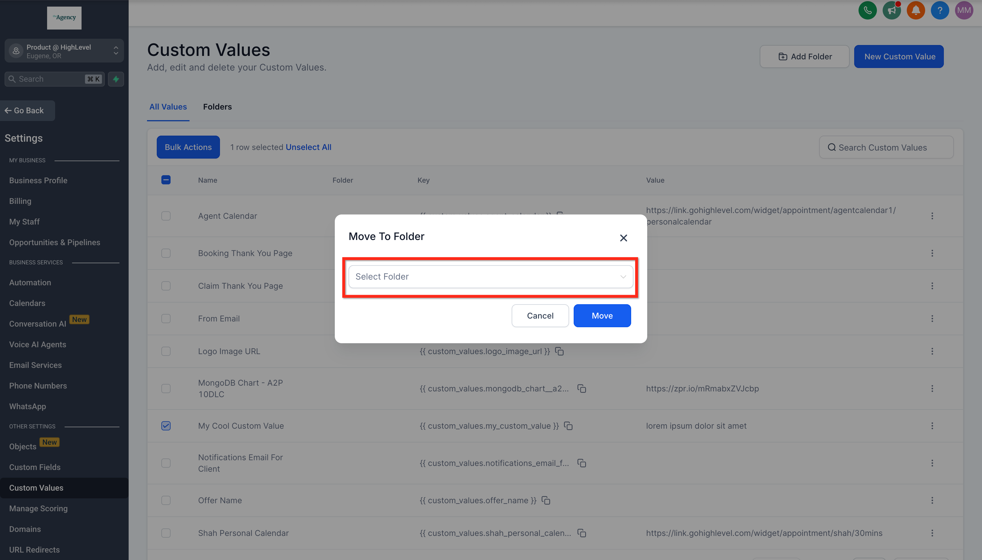 Click Move To Folder then select the target folder in the modal. After you move the selected Custom Values they will have the target folder listed in the Folder column.