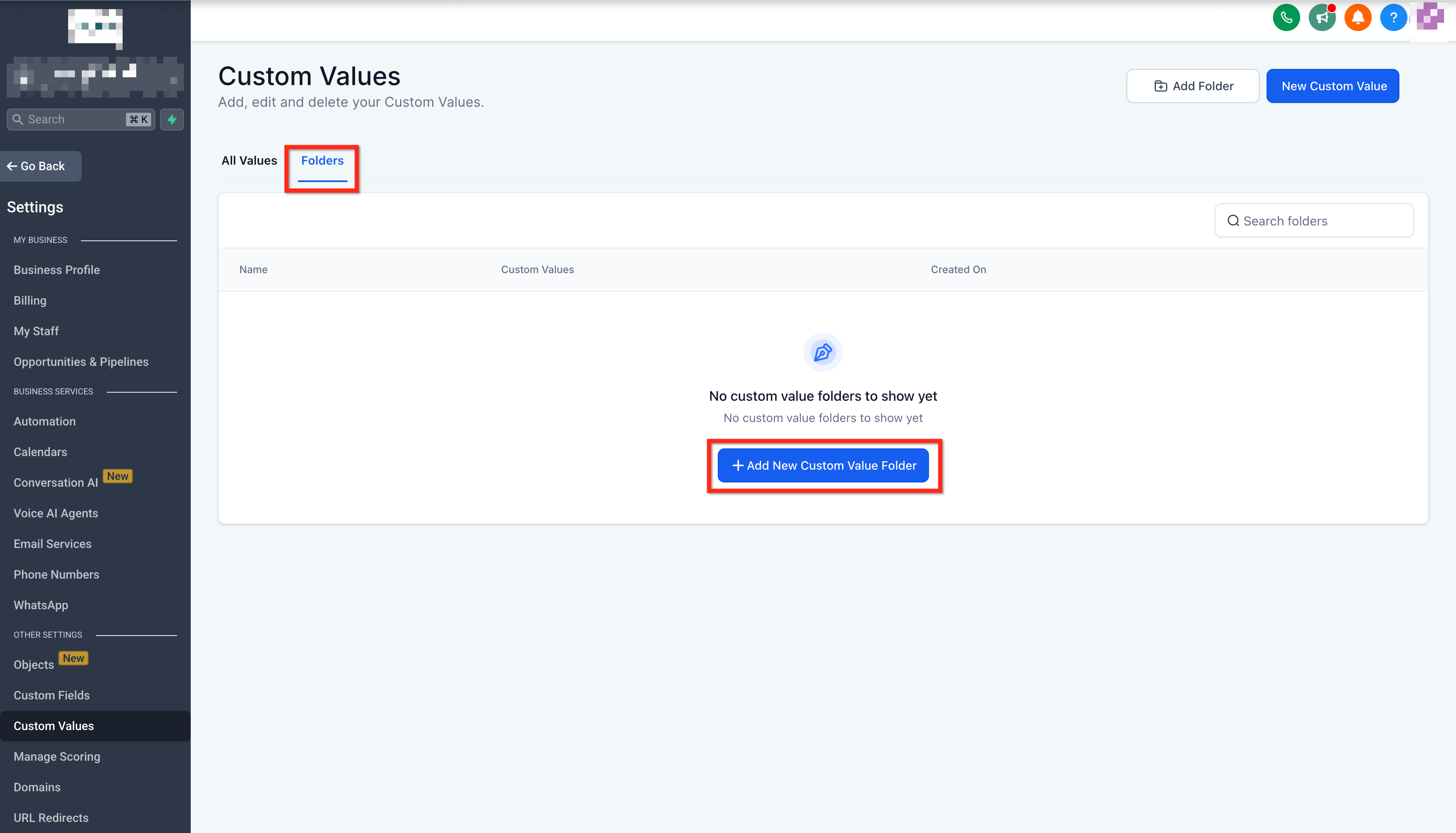 Click on the Folders tab and then the Add New Custom Value Folder button. Folders with Custom Values in them will appear in the All Values list > Folder column. All folders will be listed in the Folders list.