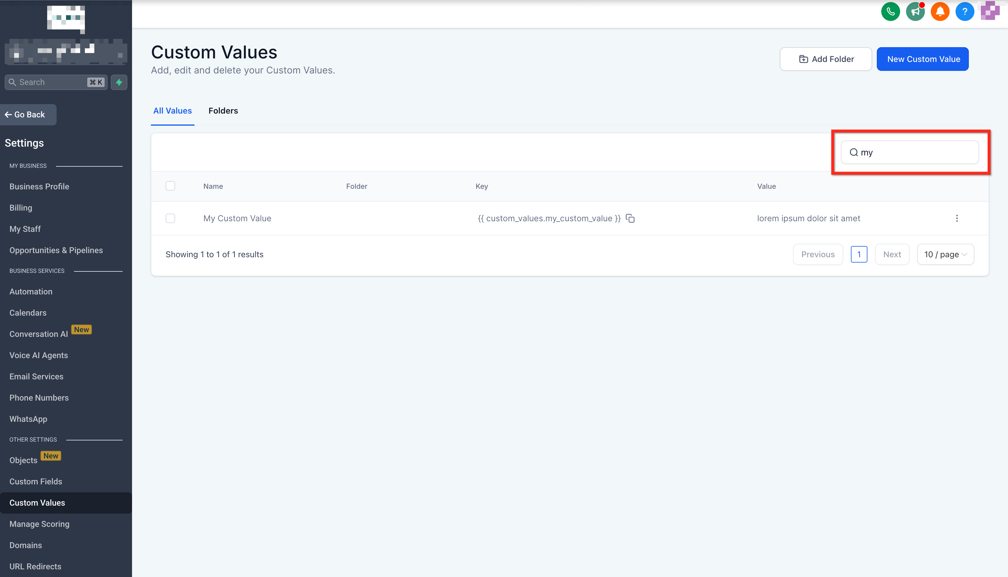 The Custom Value function is a Key and a Value that can be accessed anywhere in the platform. Instead of writing the same value over and over again in many places, you can write the Key everywhere. Then, if you change the one Value in the Custom Values list, the Key will be updated everywhere automatically.