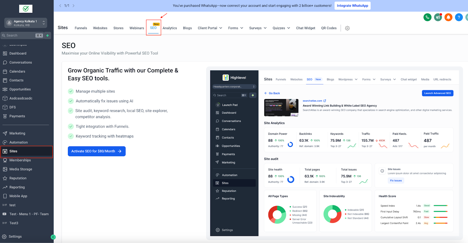 Note: The SEO module appears in a sub-account only after the agency enables SEO Reselling for that sub-account.
