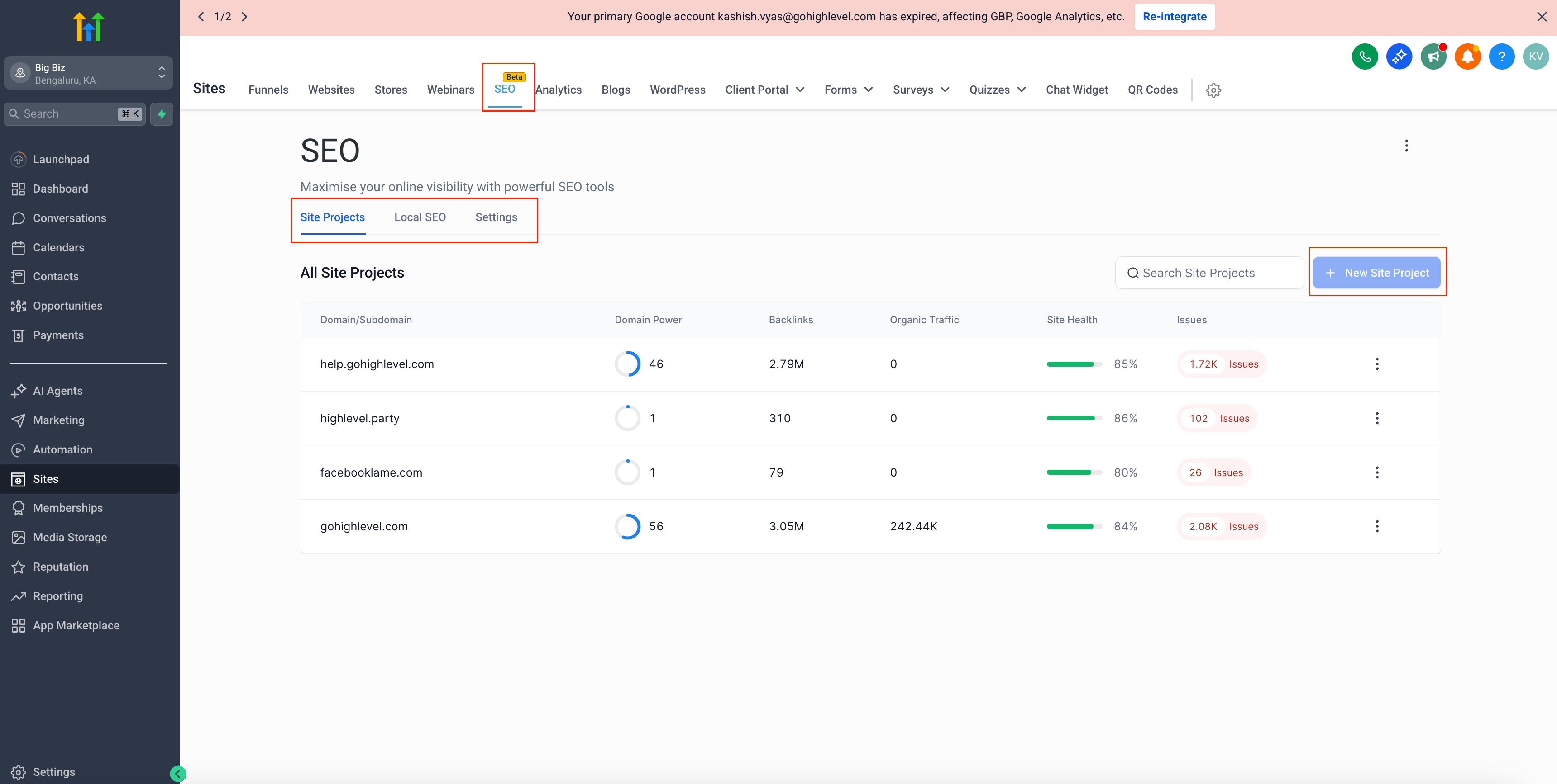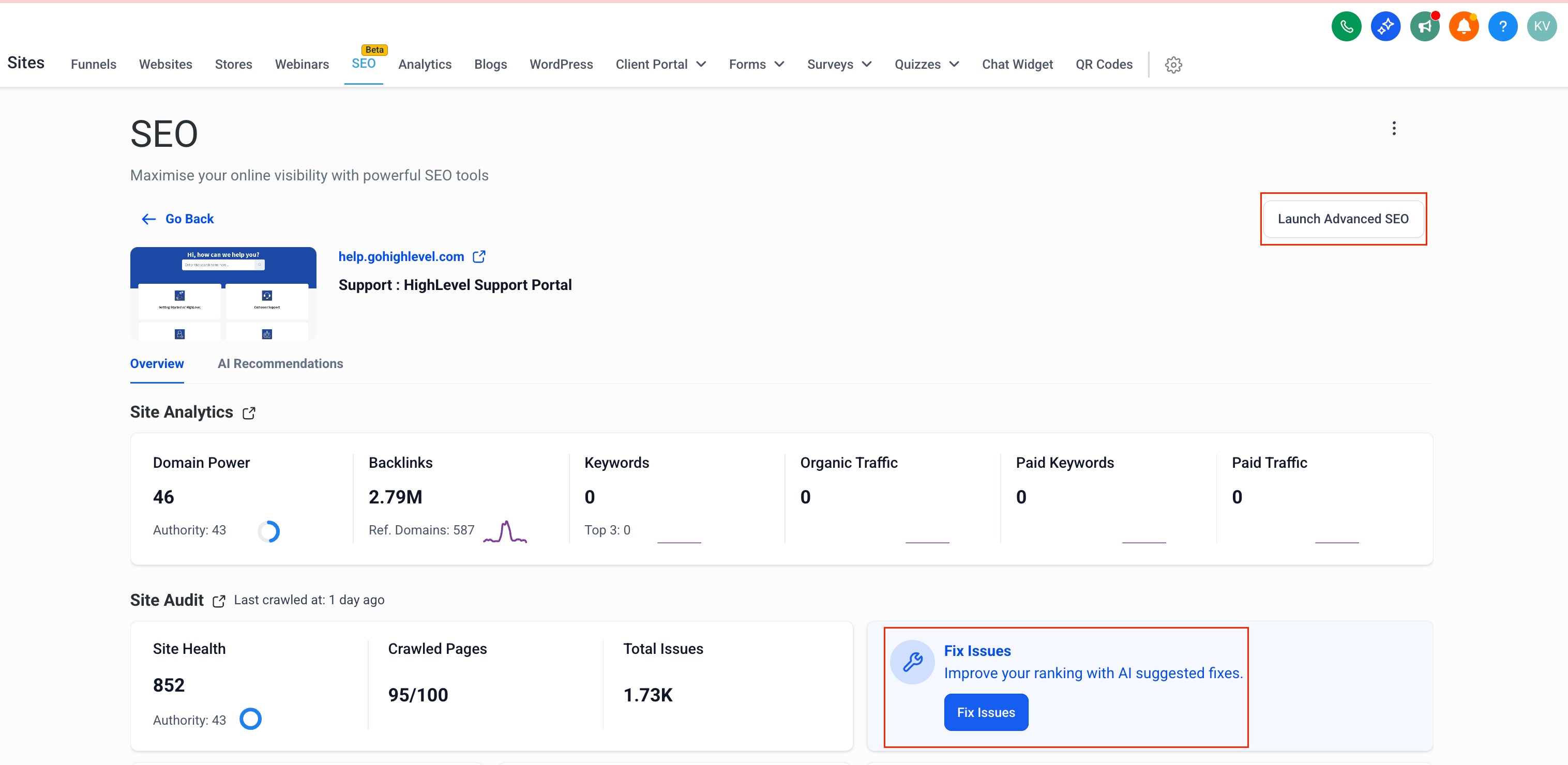 - To get started, log in to your sub-account account and navigate to Sites > SEO.