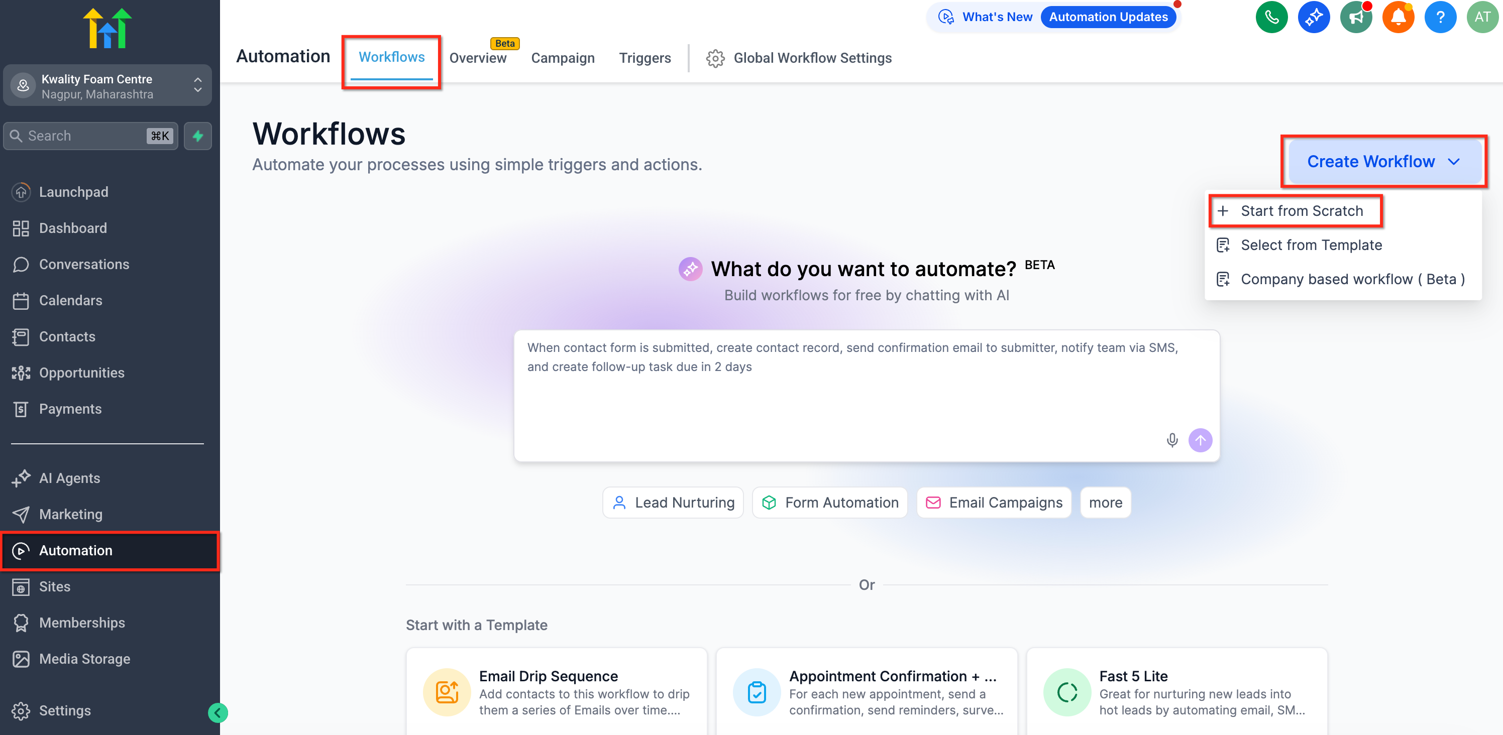 Quick-start suggestions like "Lead Nurturing," "Form Automation," and "Email Campaigns" are available below the AI input to help you get started even faster.