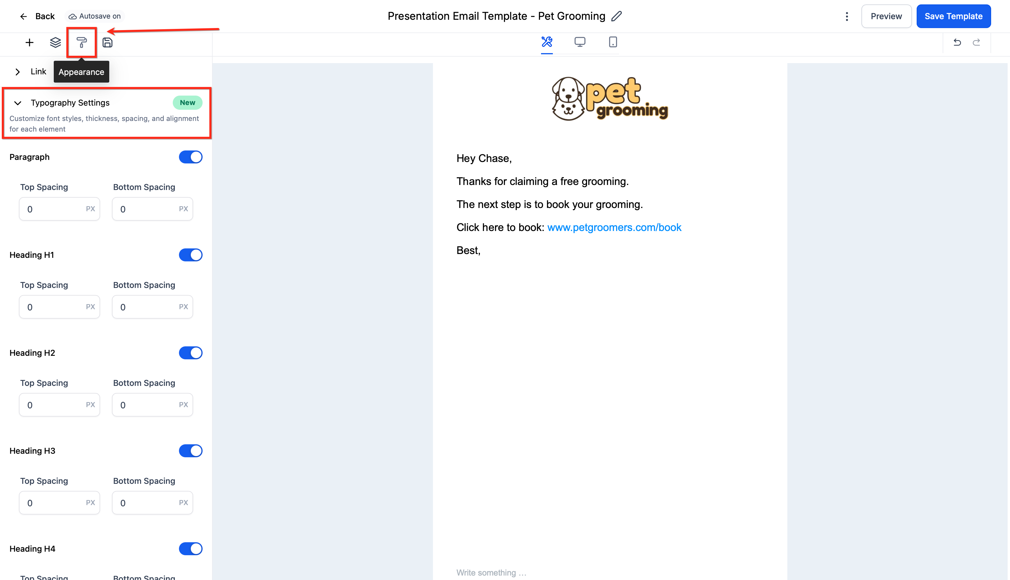 • Update your global Email Typography Settings for consistent heading and paragraph spacing across campaigns.