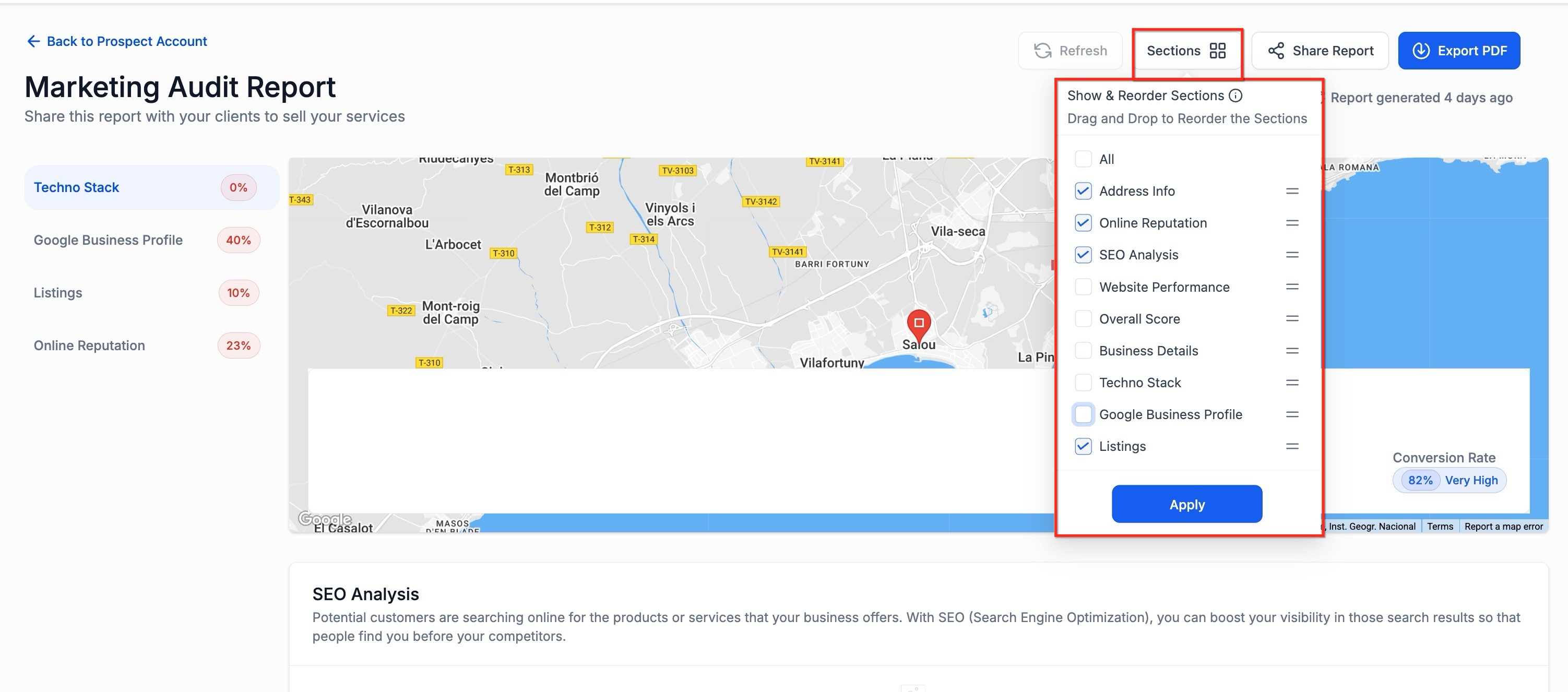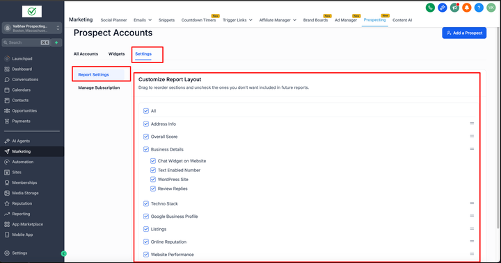 Prospect Report Layout Customization allows you to control the structure of your Marketing Audit Reports generated through the Prospecting tool in HighLevel. You can enable or disable report sections and reorder them to better support your presentation flow. This ensures your reports align with your agency’s sales process and client focus areas while maintaining flexibility for one-off adjustments.