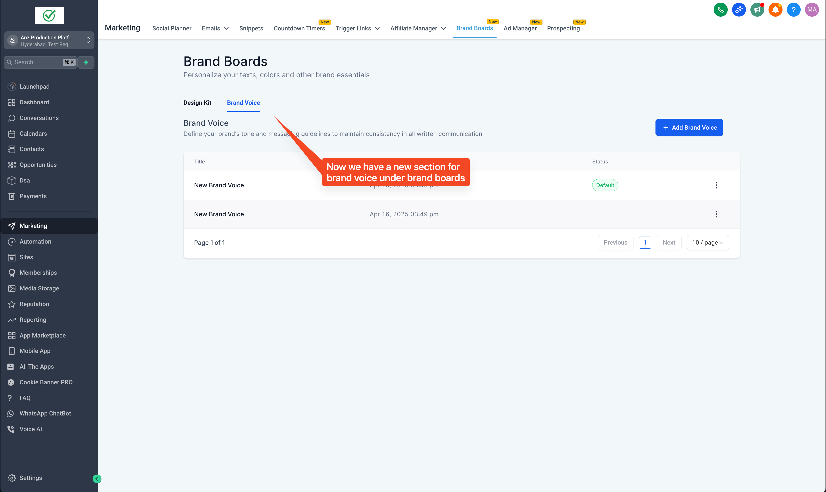 Introducing a new Brand Voice feature within Brand Boards, allowing you to define your brand's communication style and integrate it seamlessly with AI tools for consistent messaging across your marketing content.