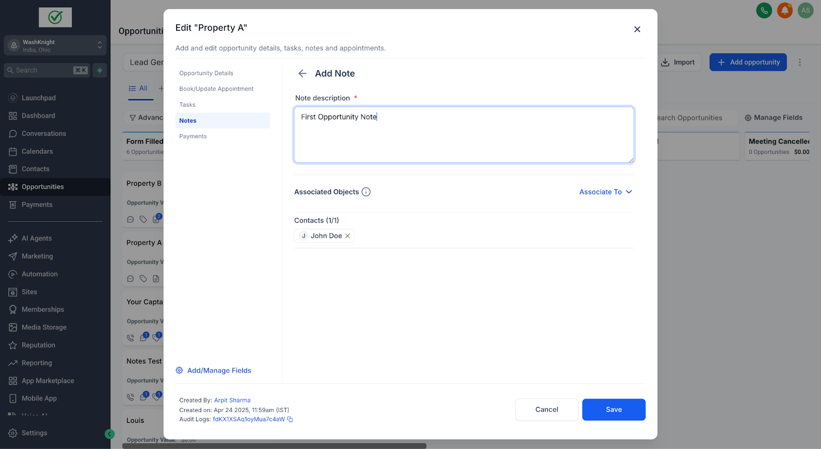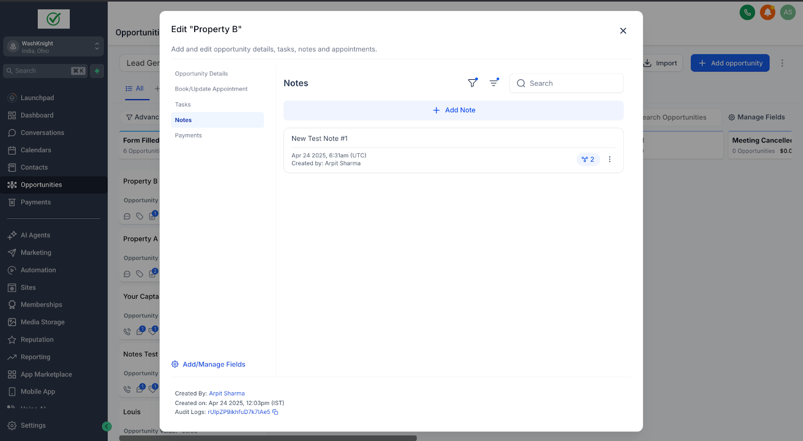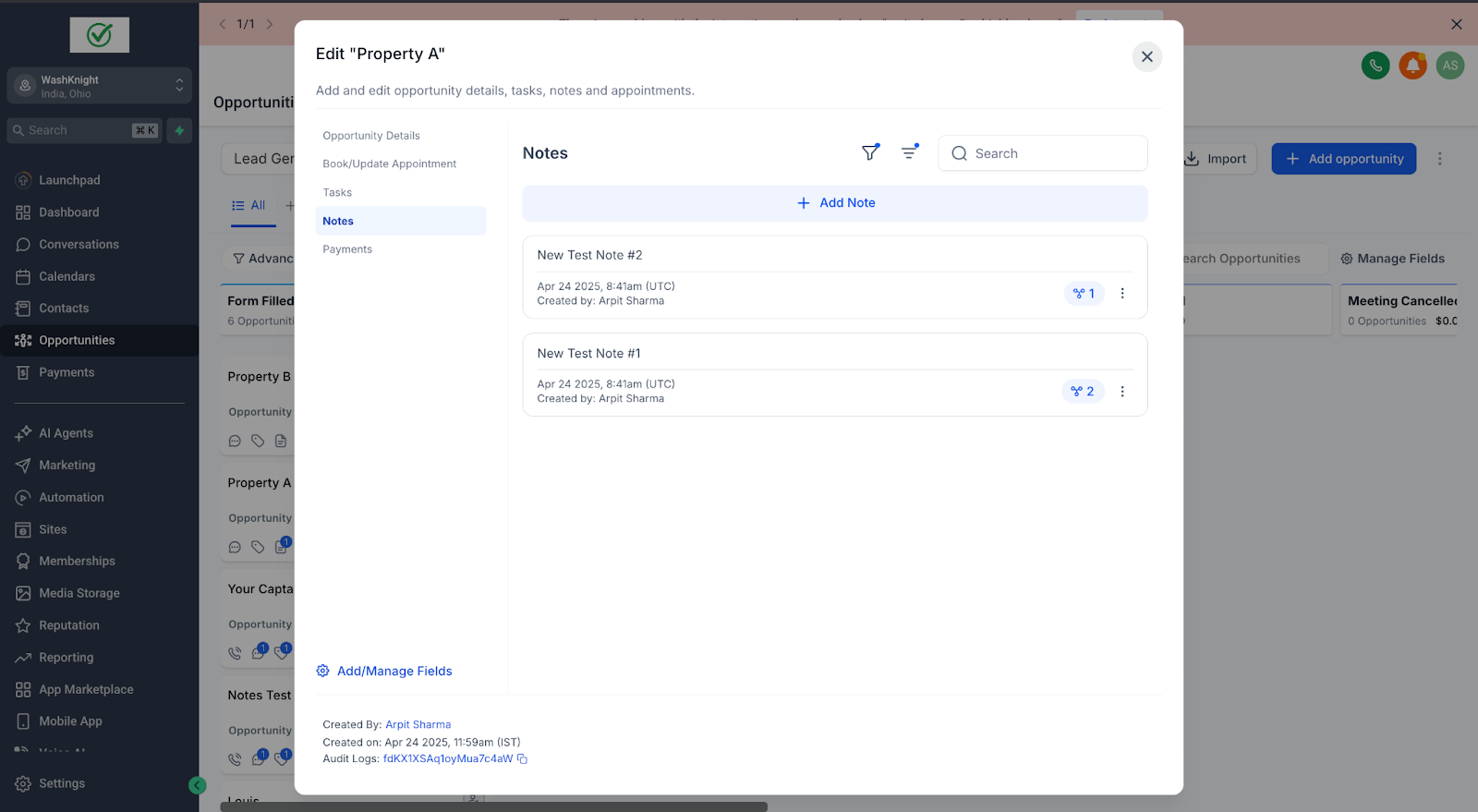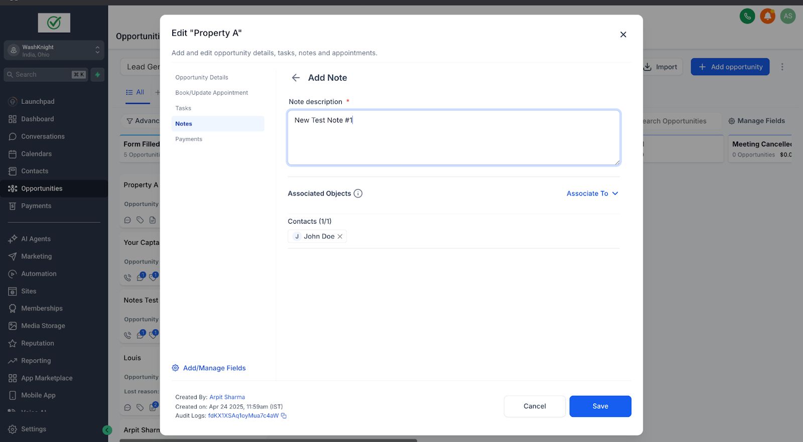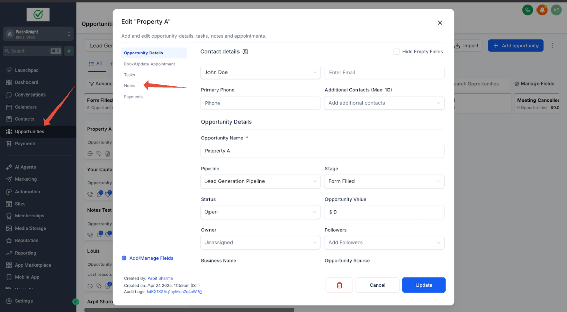 John Doe (a contact) has two opportunities for 2 different real estate properties- Property A and Property B. Sara (the Sales Agent & GHL Admin) managing the properties for John Doe wants to create specific notes for each opportunity to keep relevant information tied to each property’s opportunity only.