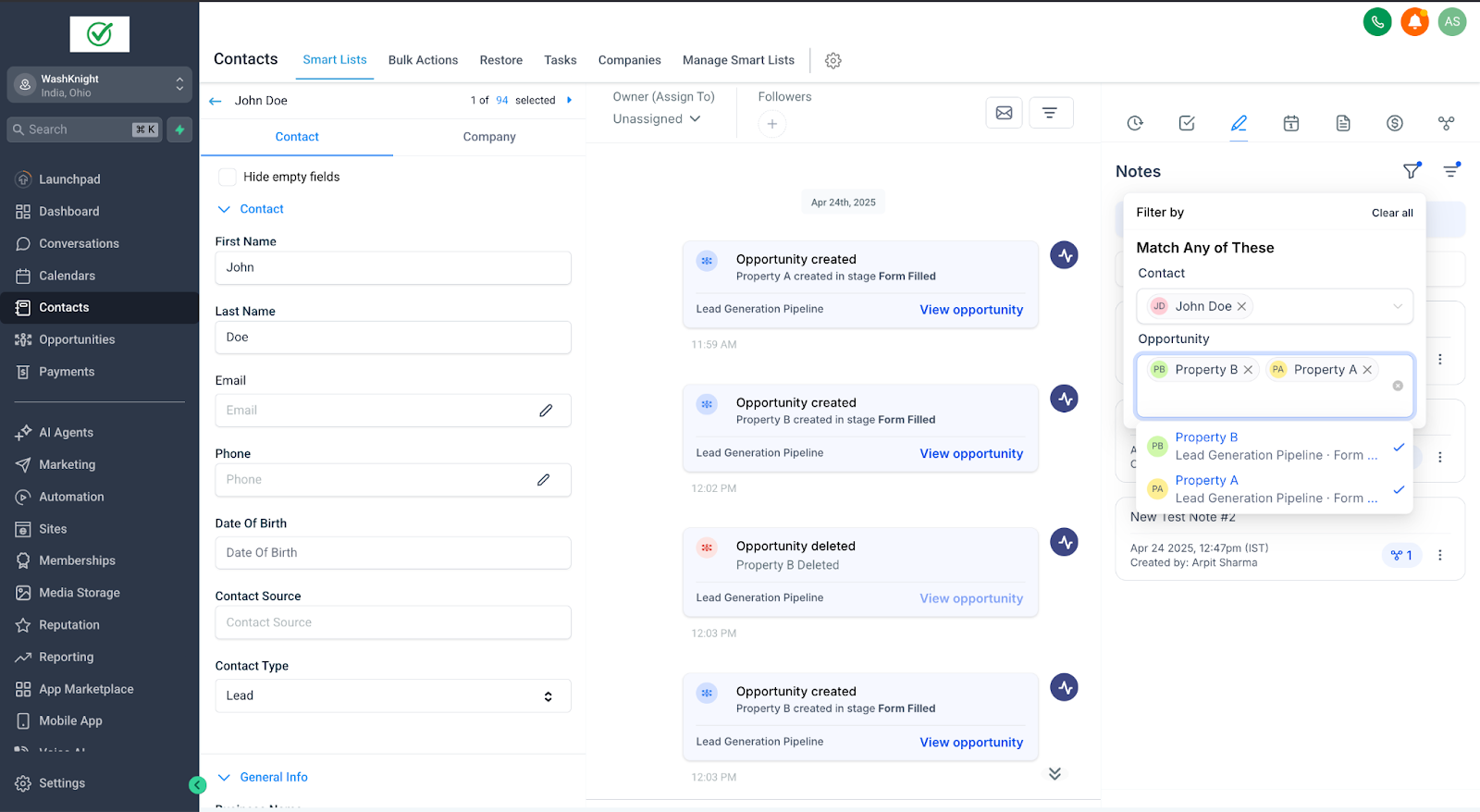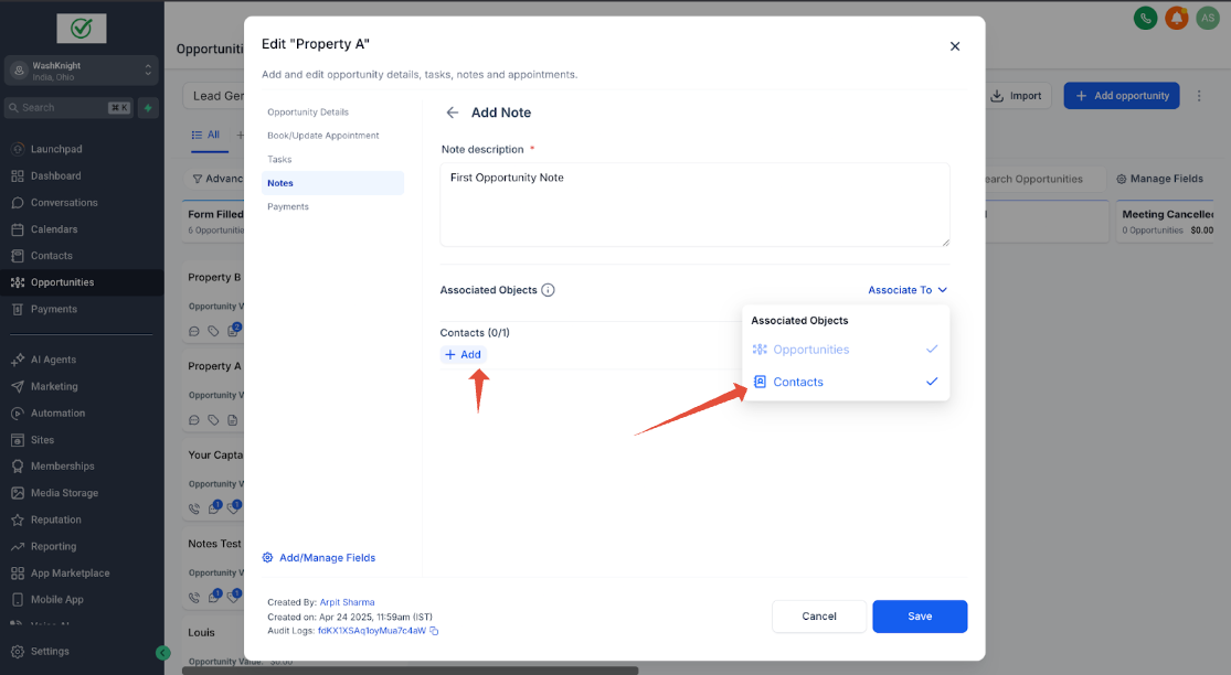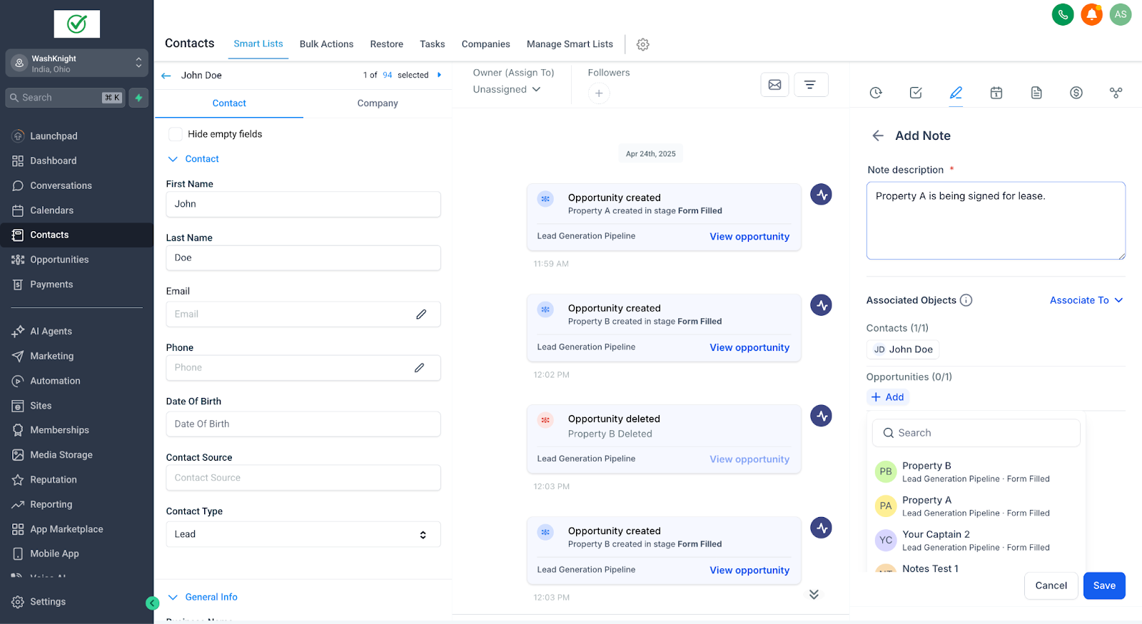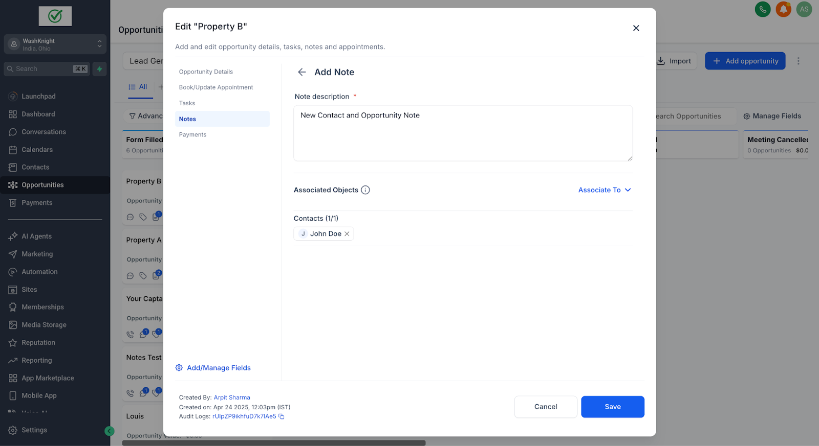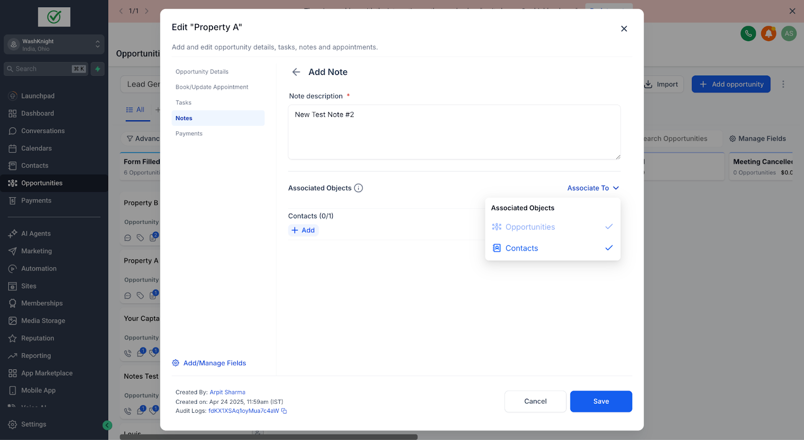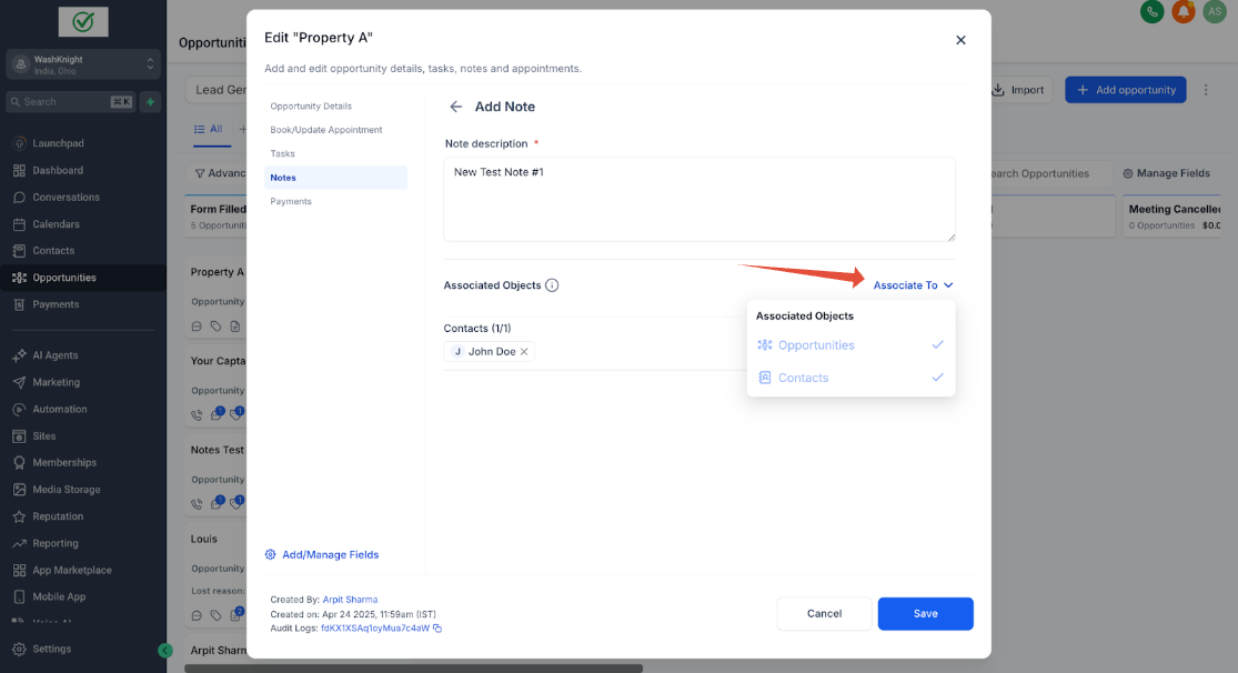 John Doe (a contact) has two opportunities for 2 different real estate properties- Property A and Property B. Sara (the Sales Agent & GHL Admin) managing the properties for John Doe wants to create specific notes for each opportunity to keep relevant information tied to each property’s opportunity only.