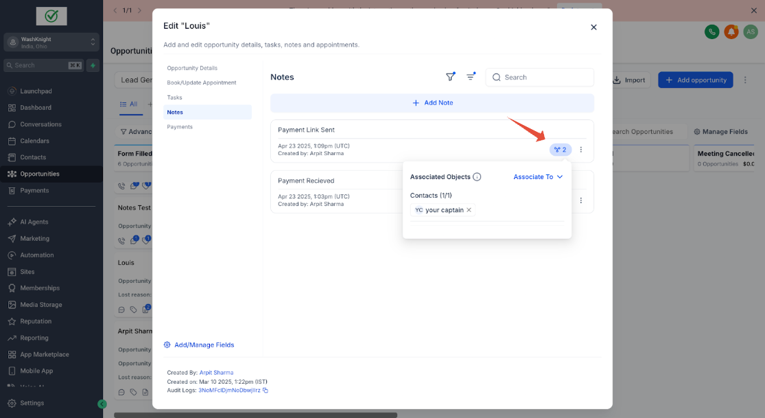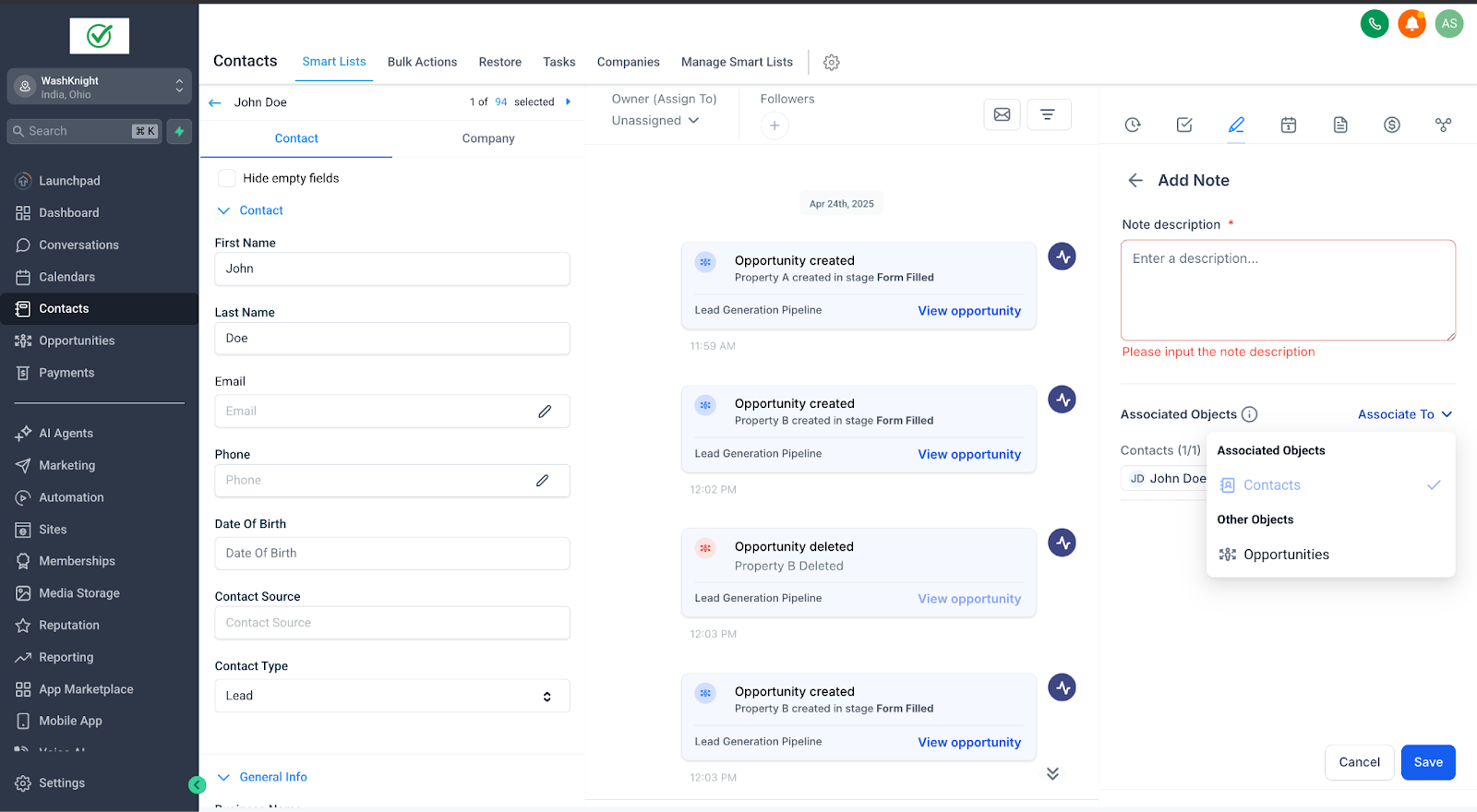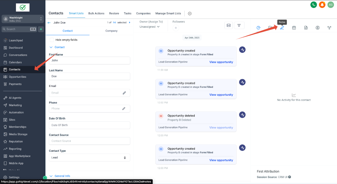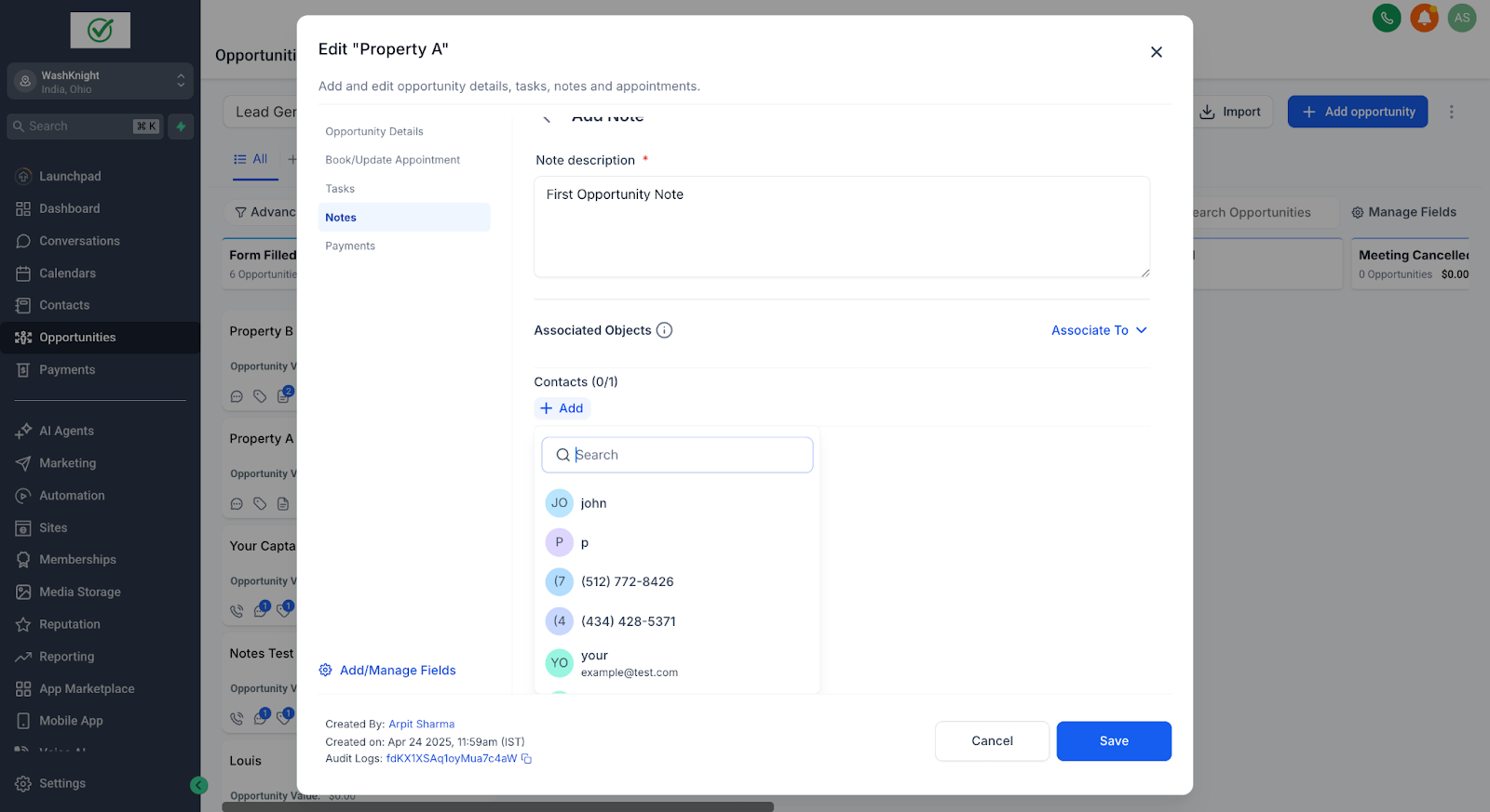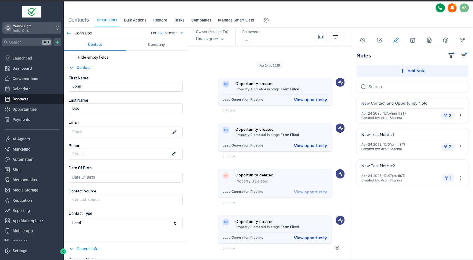 John Doe (a contact) has two opportunities for 2 different real estate properties- Property A and Property B. Sara (the Sales Agent & GHL Admin) managing the properties for John Doe wants to create specific notes for each opportunity to keep relevant information tied to each property’s opportunity only.