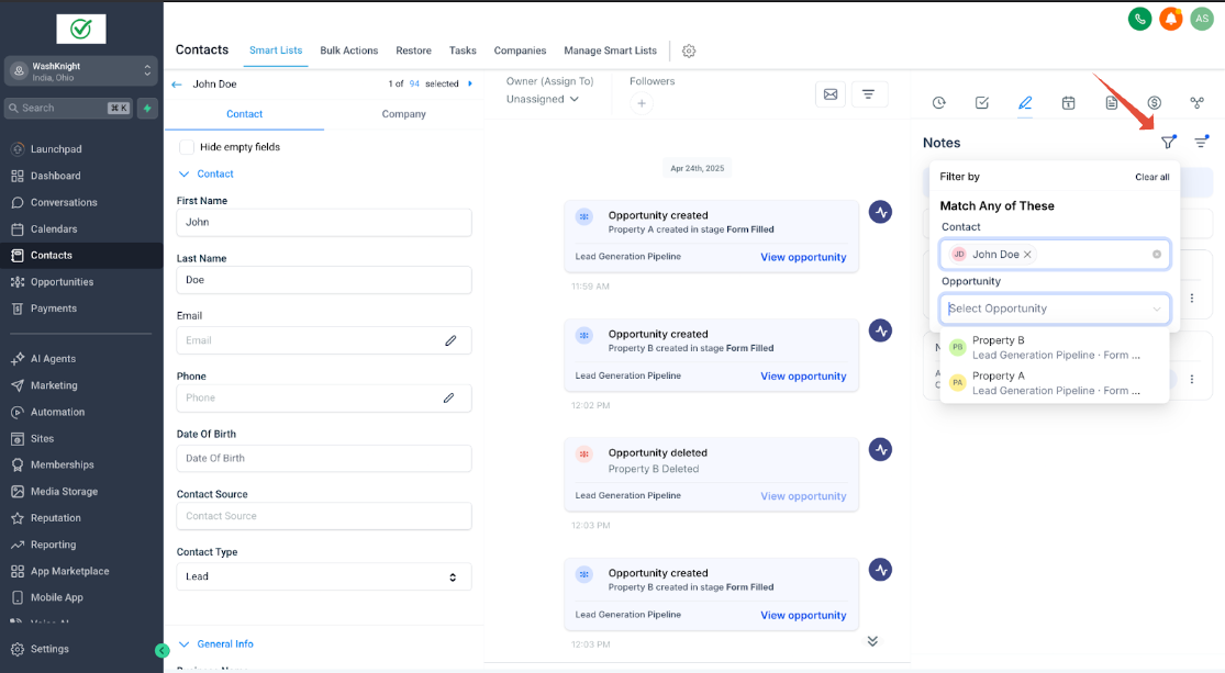 Filtering in Contacts: In the Contacts tab, selecting John Doe and going to Notes, Sara can filter notes by Opportunities or Contacts to view exactly what she needs.