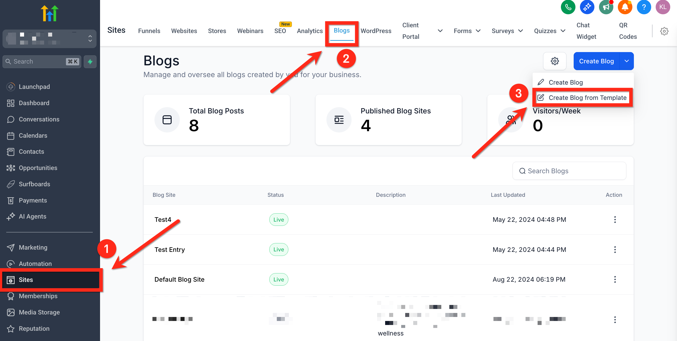 Navigate to the left sidebar and click Sites > Blogs