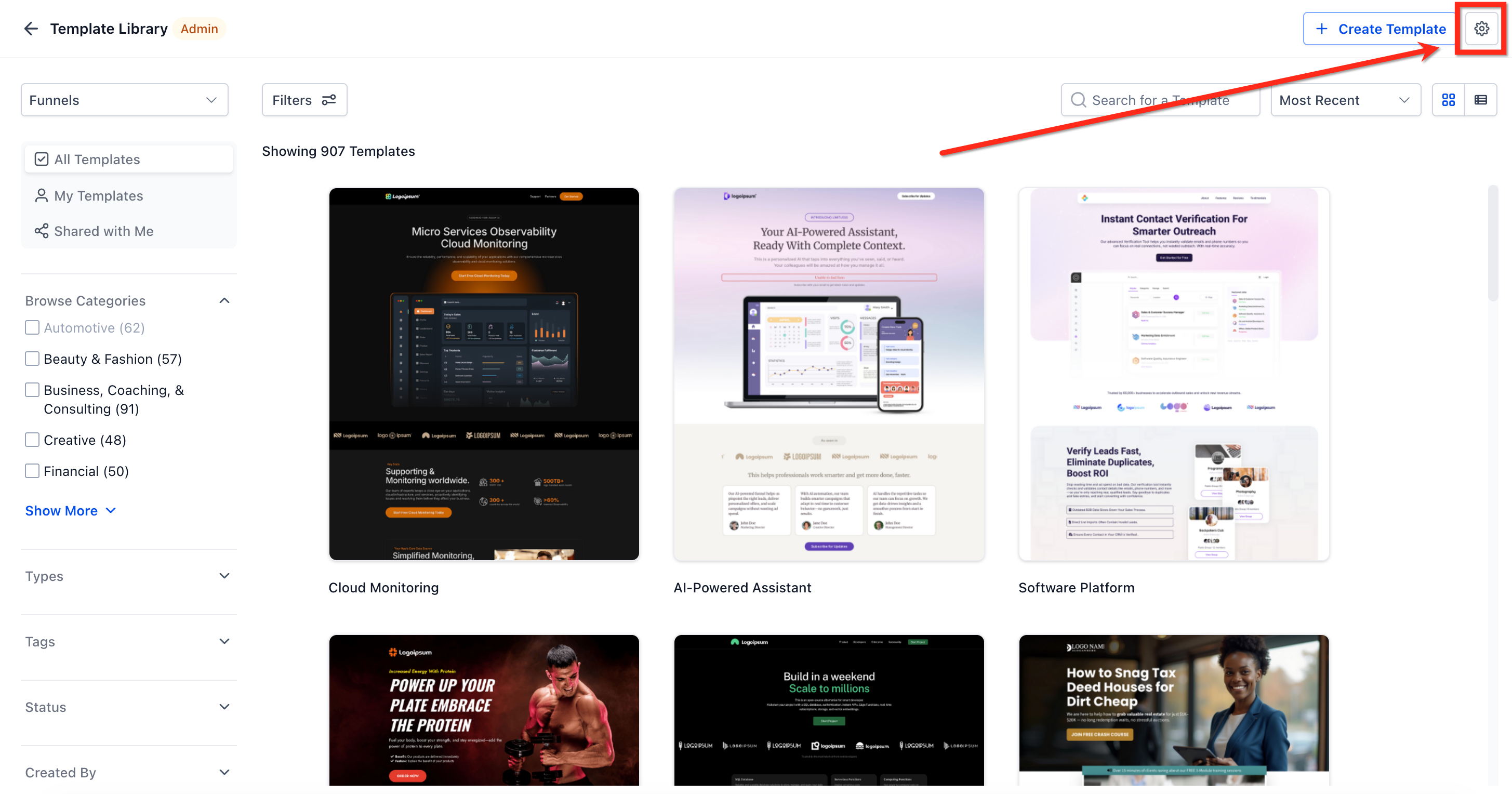 Click on the Settings (Gear Icon) button in the top-right corner of the Template Library module.