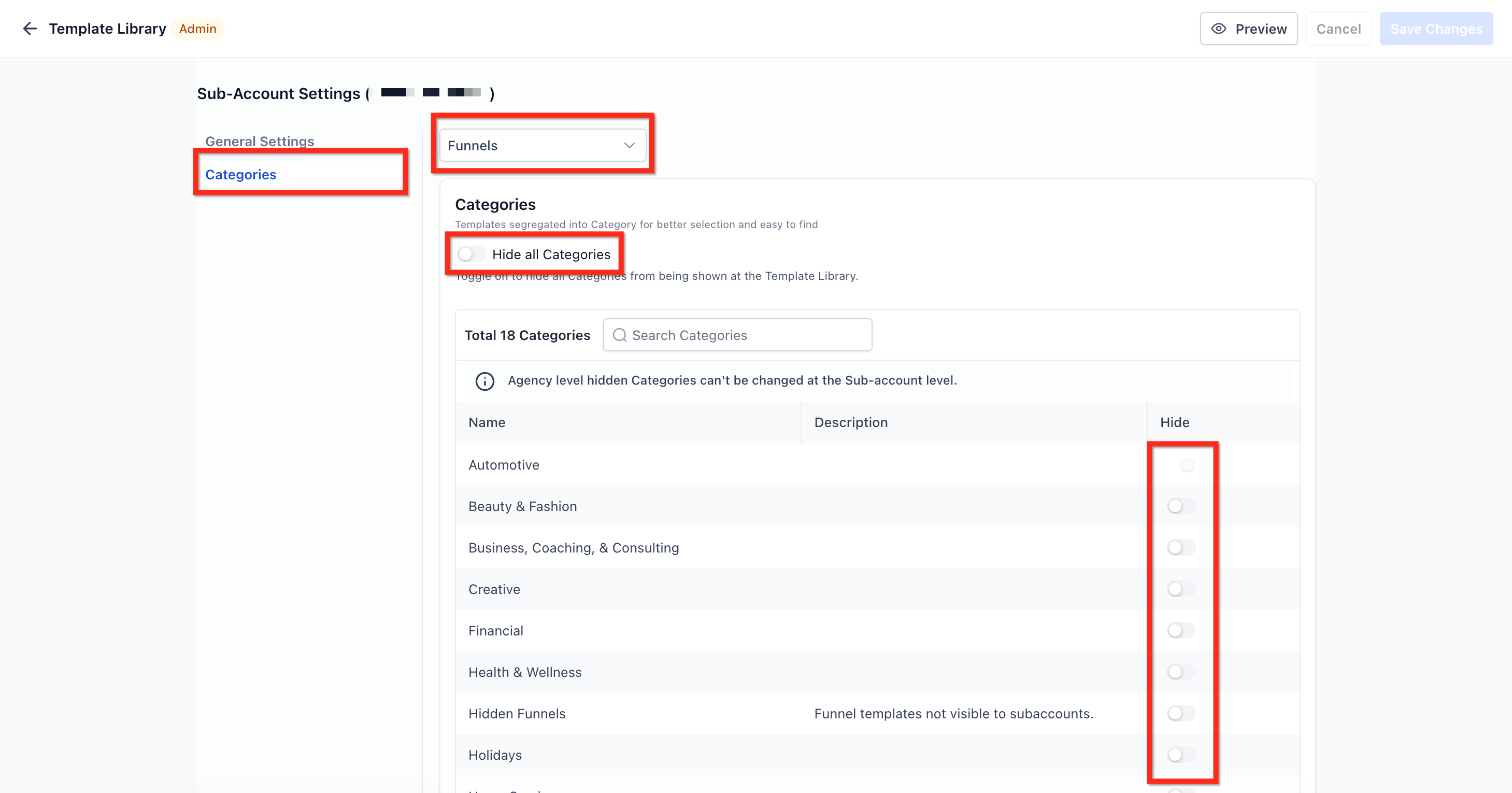 This guide walks you through the steps to hide the template library for a specific sub-account or limit visibility by module. This helps streamline the experience for location users and prevent clutter or misuse.
