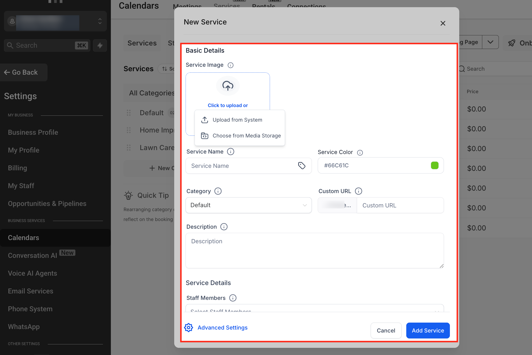 Service Image: Upload an image that visually represents your service. You can upload from your device or a Media Library.