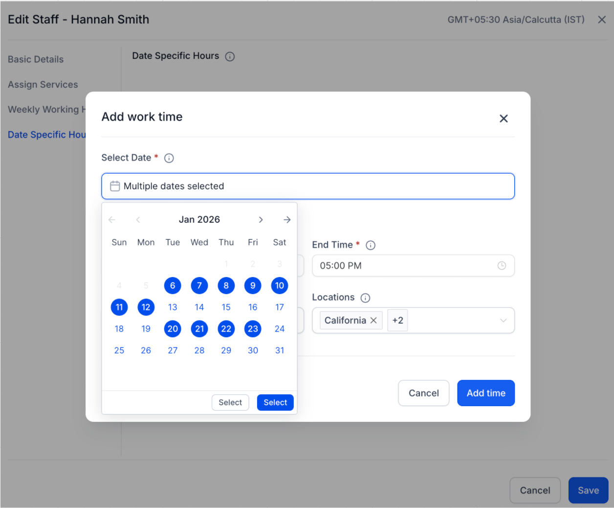 - In the Date-Specific Hours tab, select multiple dates in the date picker.