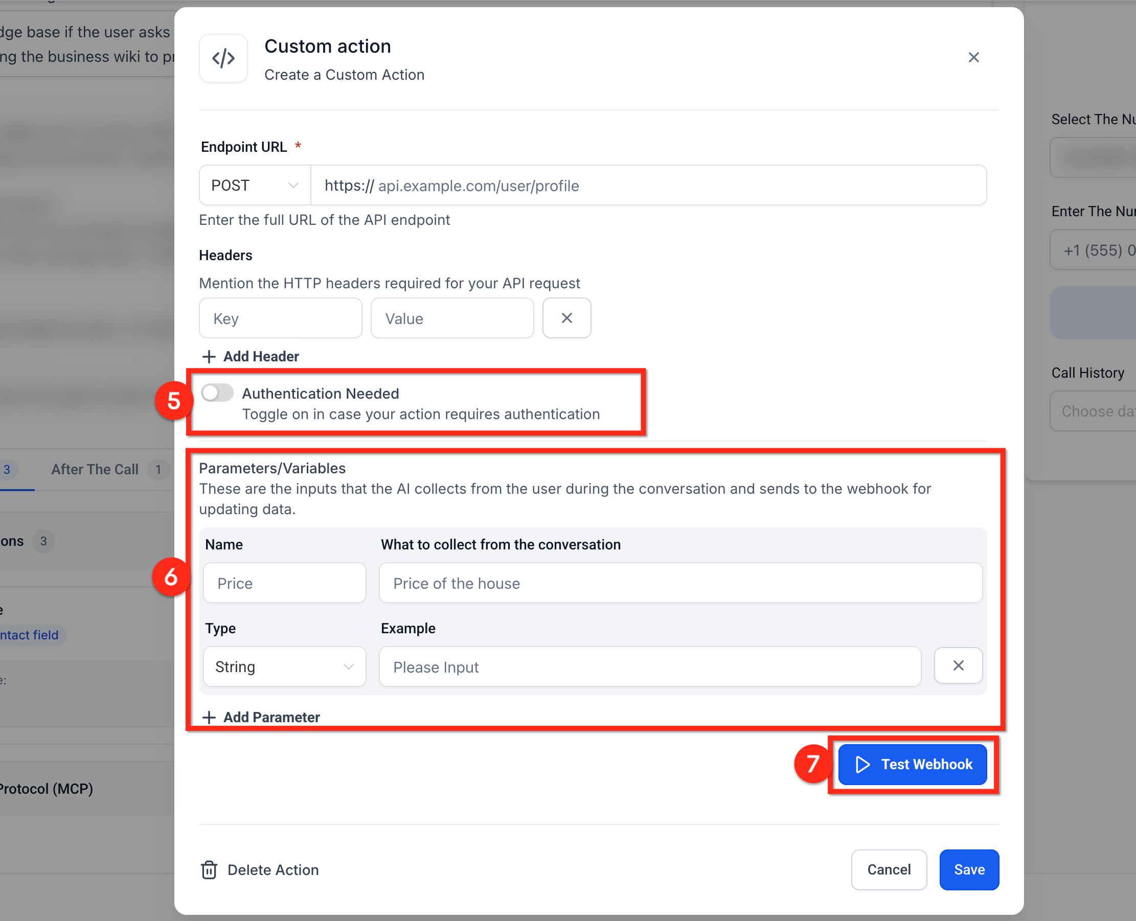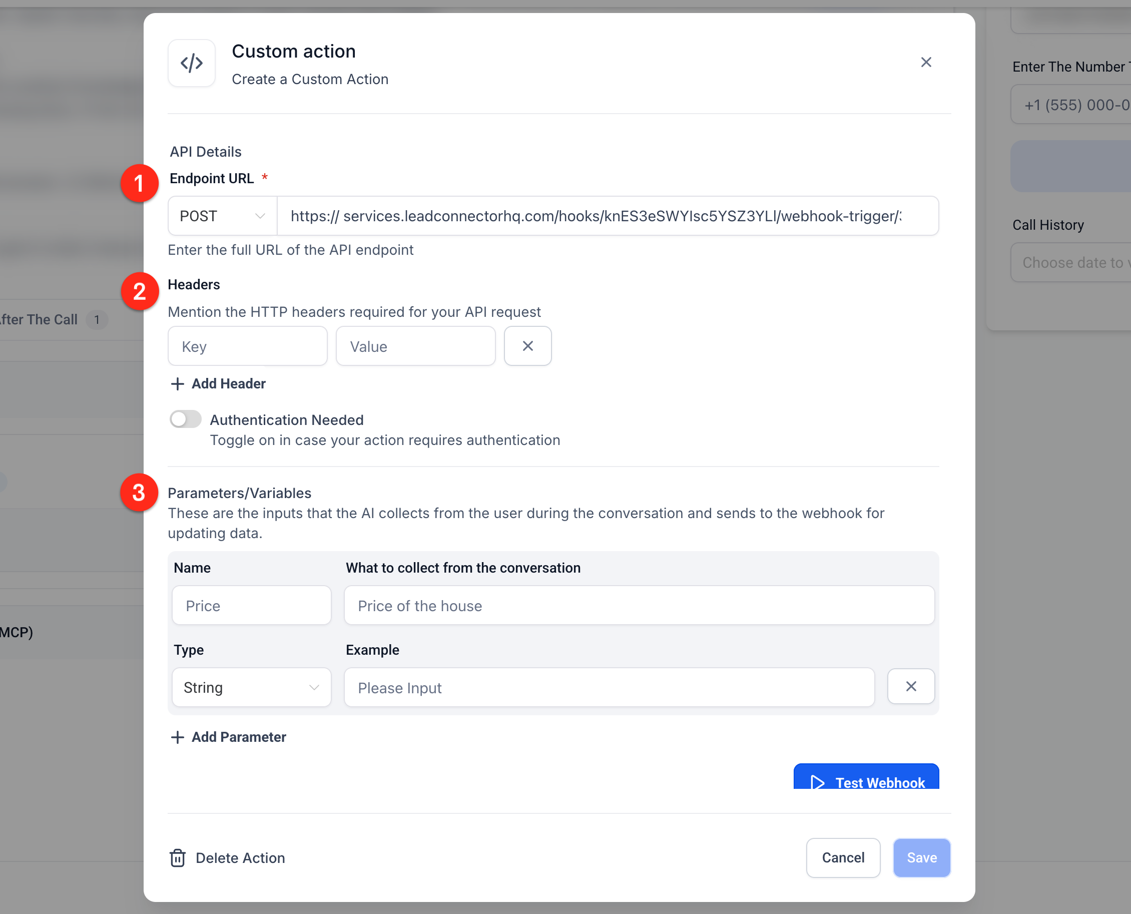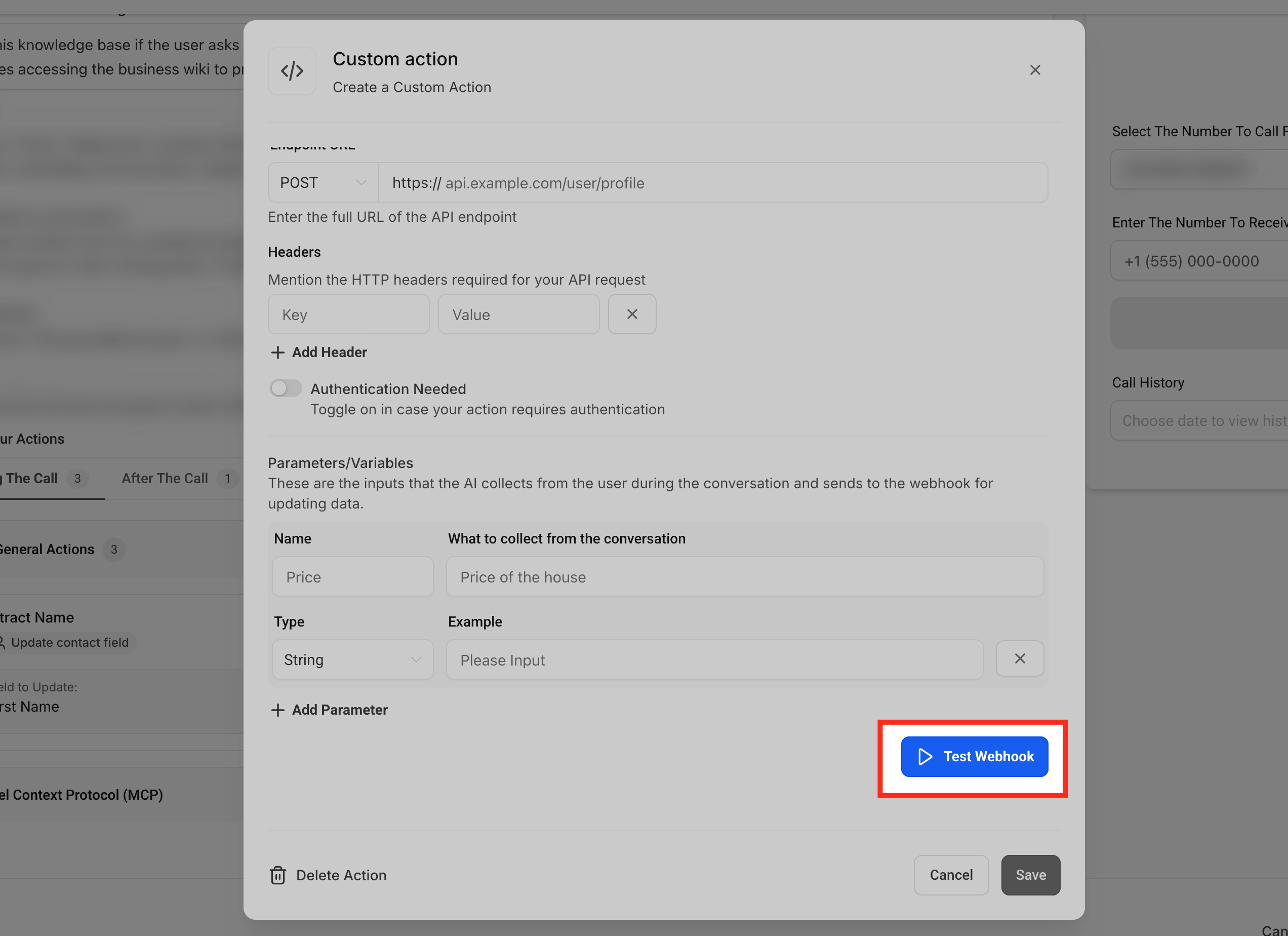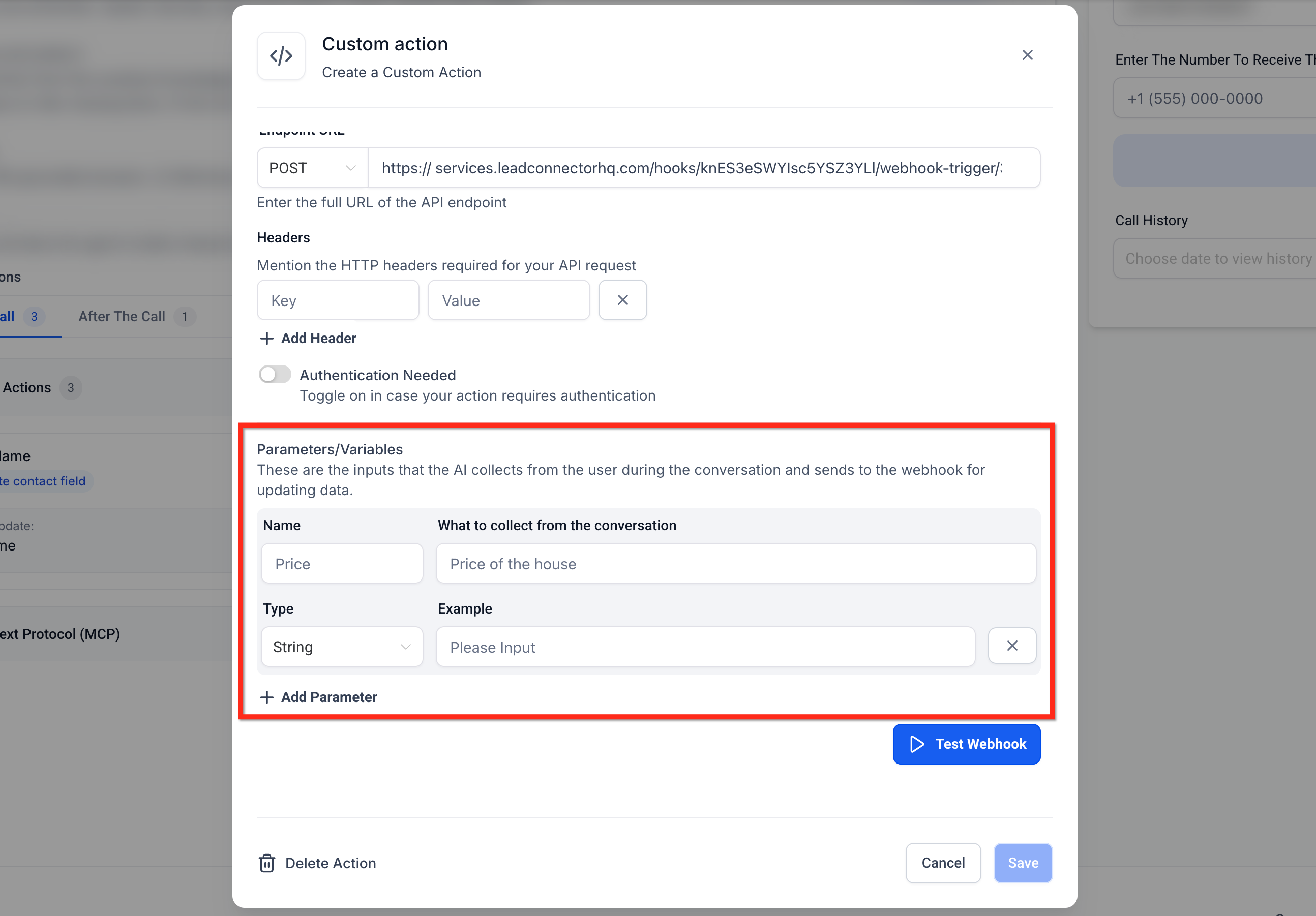 Voice AI Custom Actions allow AI agents to trigger custom POST webhook calls to external APIs during a live conversation. These actions can include authentication, headers, and dynamic parameters collected in real-time from the call. This enables agents to retrieve or send information instantly based on what the caller says.