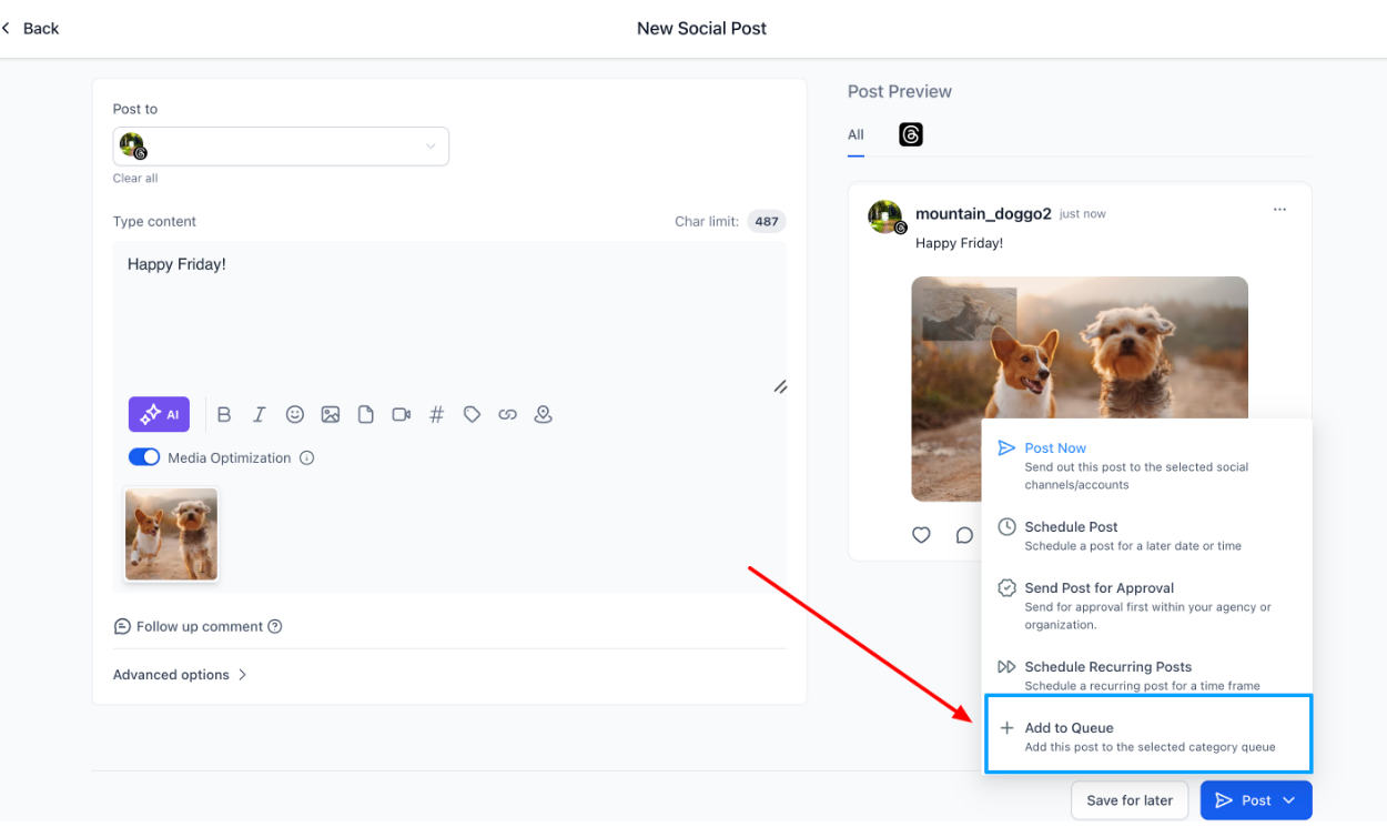Go to Queue → New Post, write your content, add media, optionally create Variations to rotate versions, choose its position by moving the post to desired position in the queue.