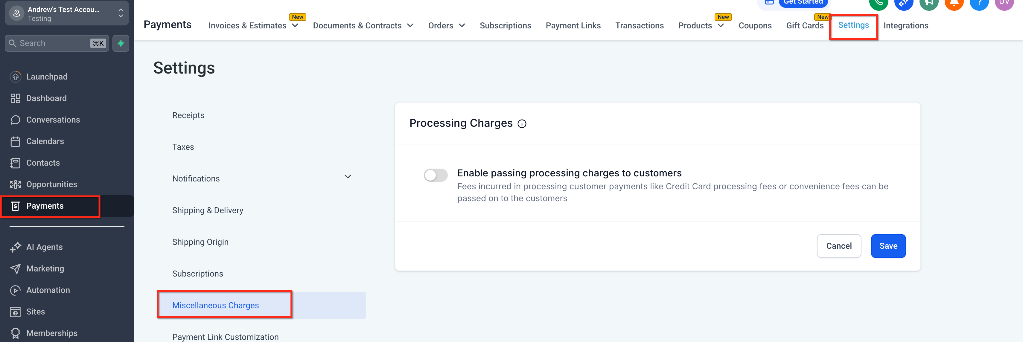 The Processing Charge feature in HighLevel allows businesses to automatically add extra fees, such as processing charges, convenience fees, or miscellaneous charges to customer payments. This functionality is designed to help businesses offset costs associated with payment processing and provide clear, itemized fees to customers during checkout or invoicing.