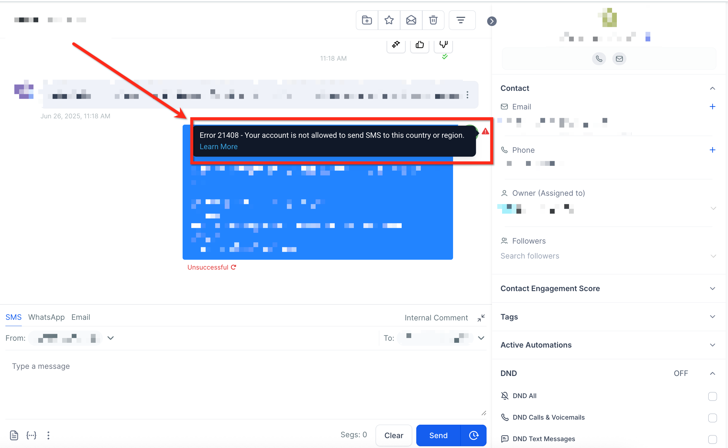 The person you are trying to message has opted out of receiving messages from your phone number, Channels sender, or Messaging Service or has Do Not Disturb (DND) status enabled in their contact profile