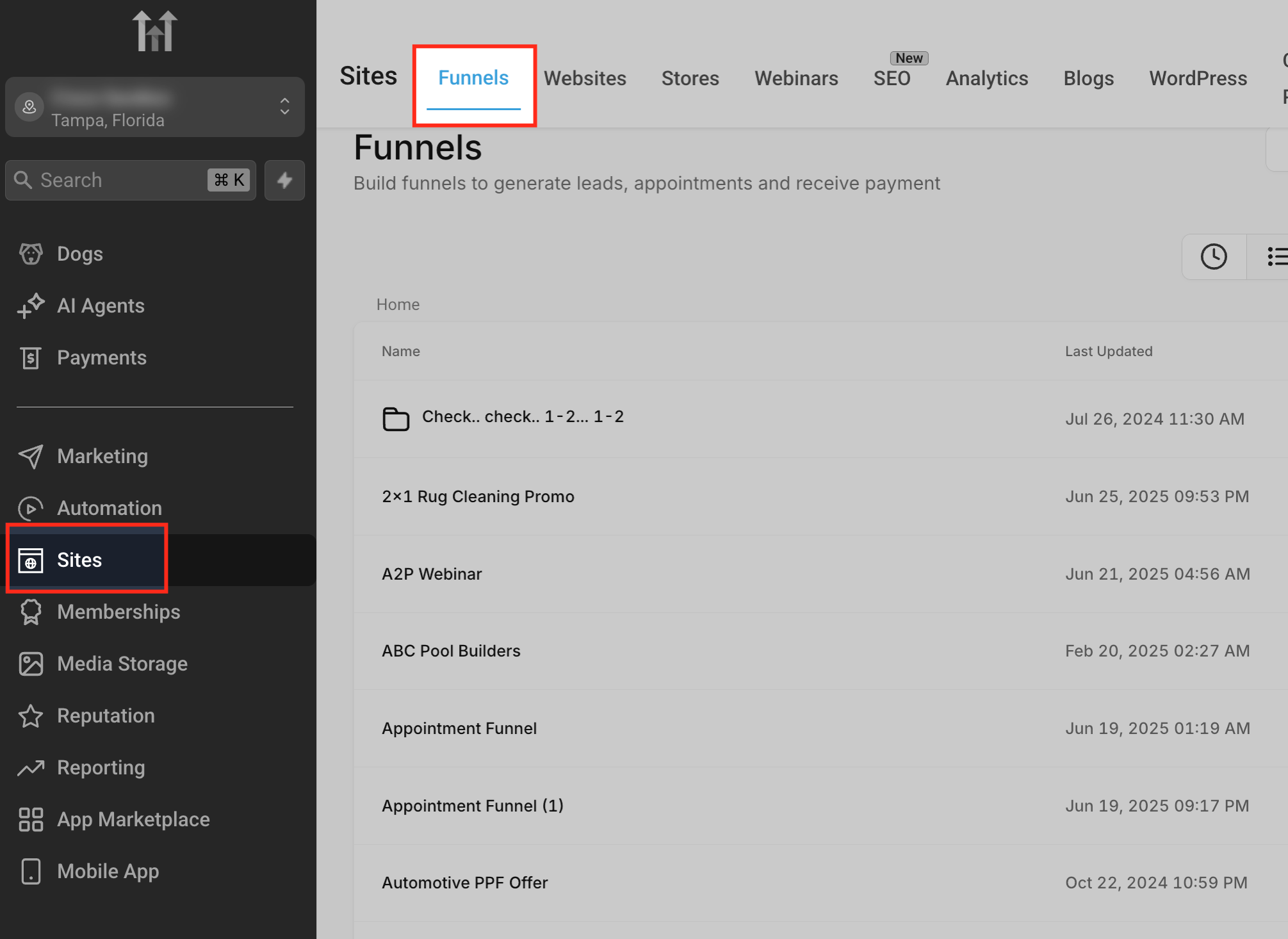 From the left-hand menu, click on Sites and then select the Funnels tab at the top. This opens your list of funnels where you can manage or create funnel pages that contain form elements.