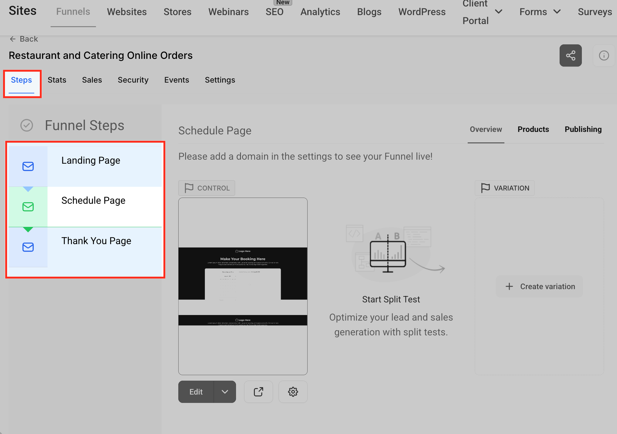 Click the Steps tab to view all funnel steps within the selected funnel. From here, choose the specific step where you want to add or edit a form.