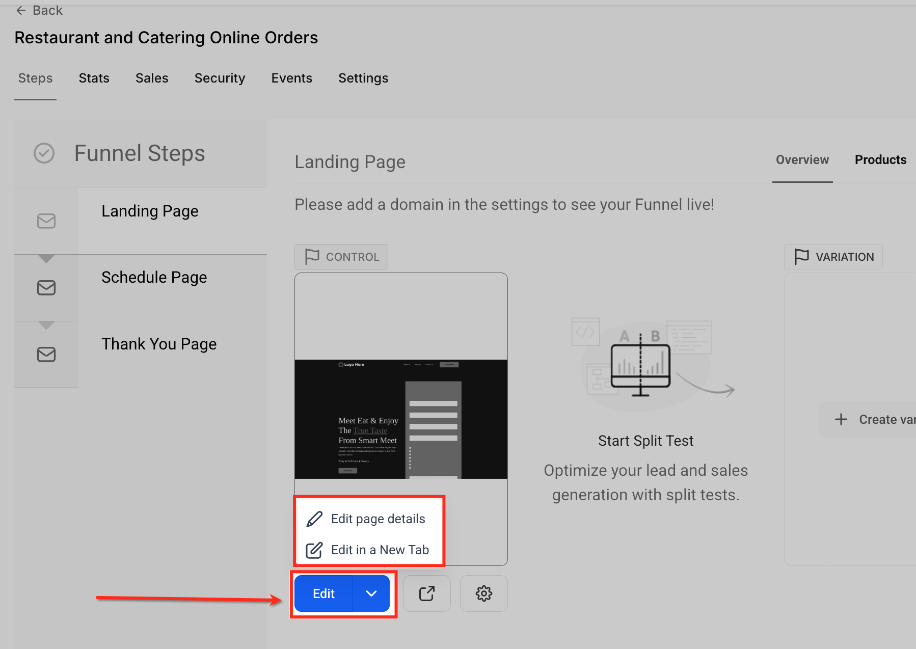 Click the Edit button below the funnel step preview to start editing the page. You can choose Edit page details to update basic settings or Edit in a New Tab to open the Funnel Page Builder in a separate tab for full-page editing.