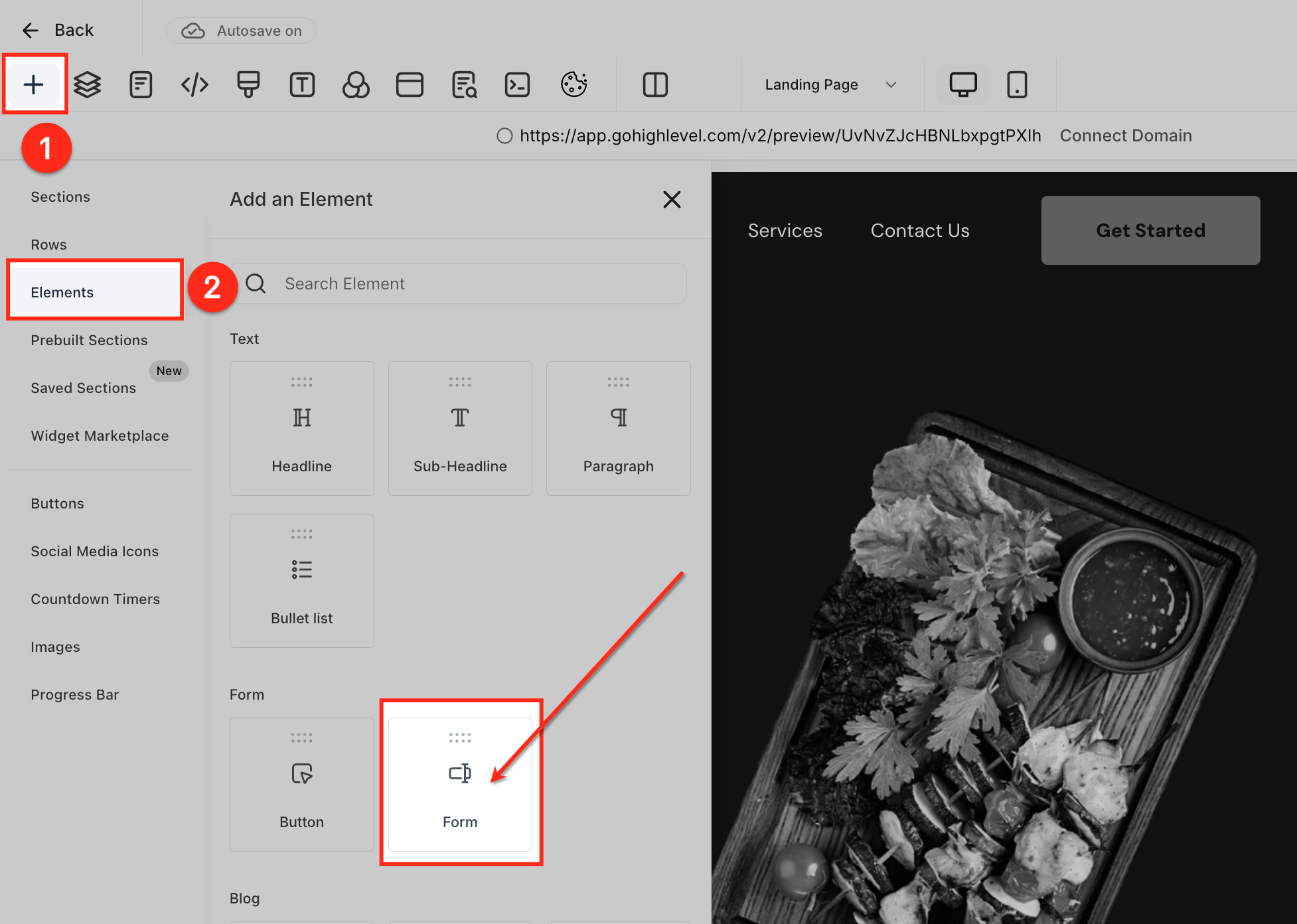 Click the + icon in the top toolbar to open the sidebar, then select Elements from the menu. Scroll to the Form section and drag the Form element onto your page to begin configuring it.
