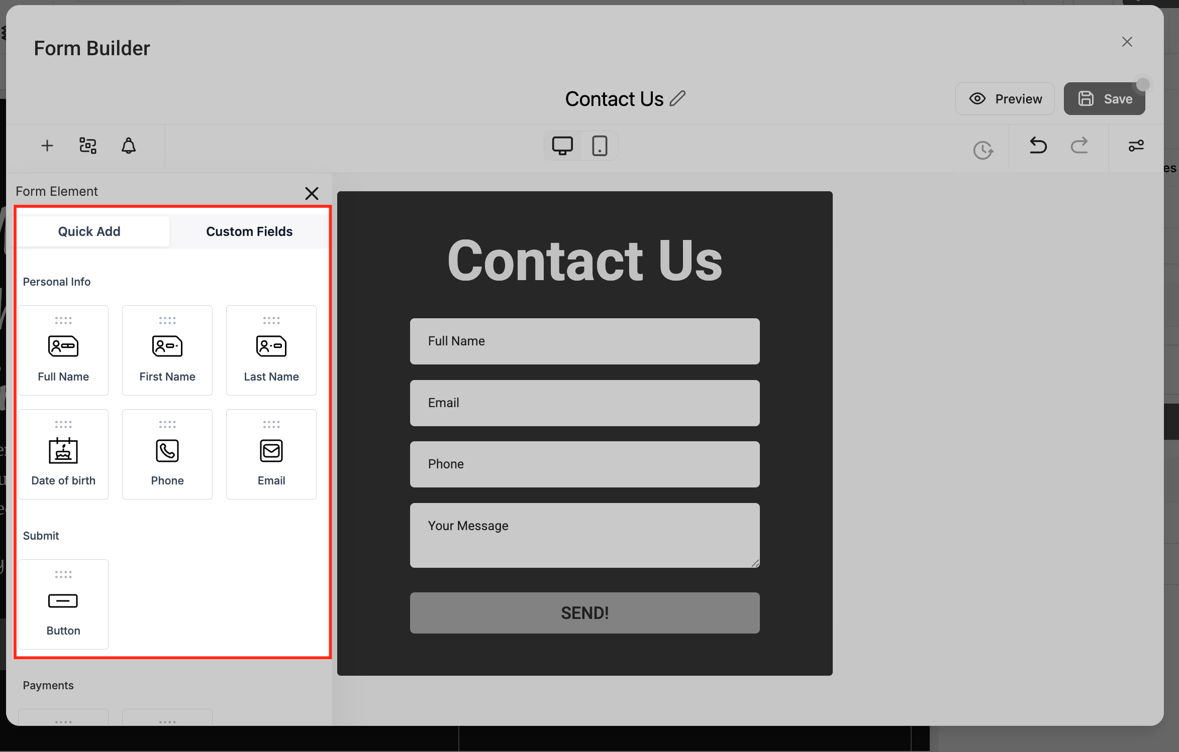 Quick Add: Instantly drag common fields like Full Name, Email, and Phone into your form.