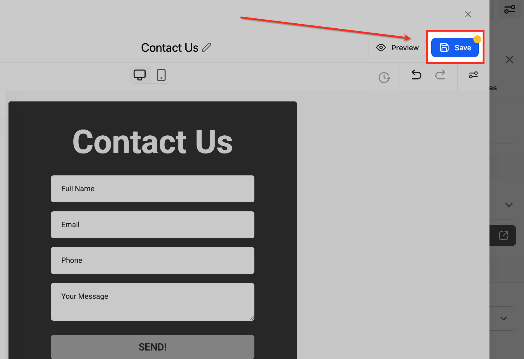 Once your form edits are complete, click the Save button in the top-right corner of the pop-up. This action instantly applies your updates and closes the modal, returning you to your exact spot in the Funnel Builder—without any page reloads or tab switching. This ensures a seamless editing experience where your funnel-building flow remains uninterrupted.
