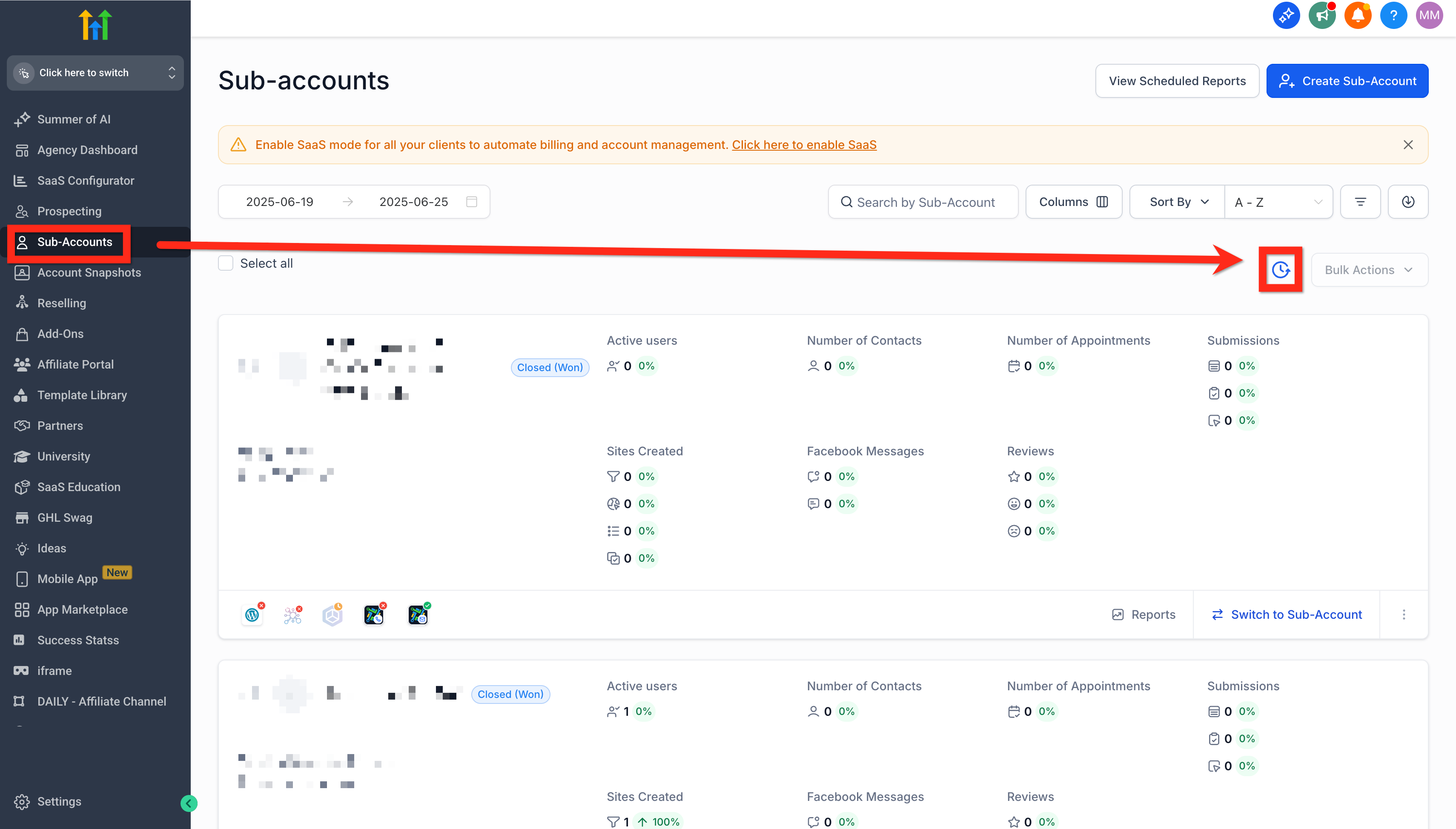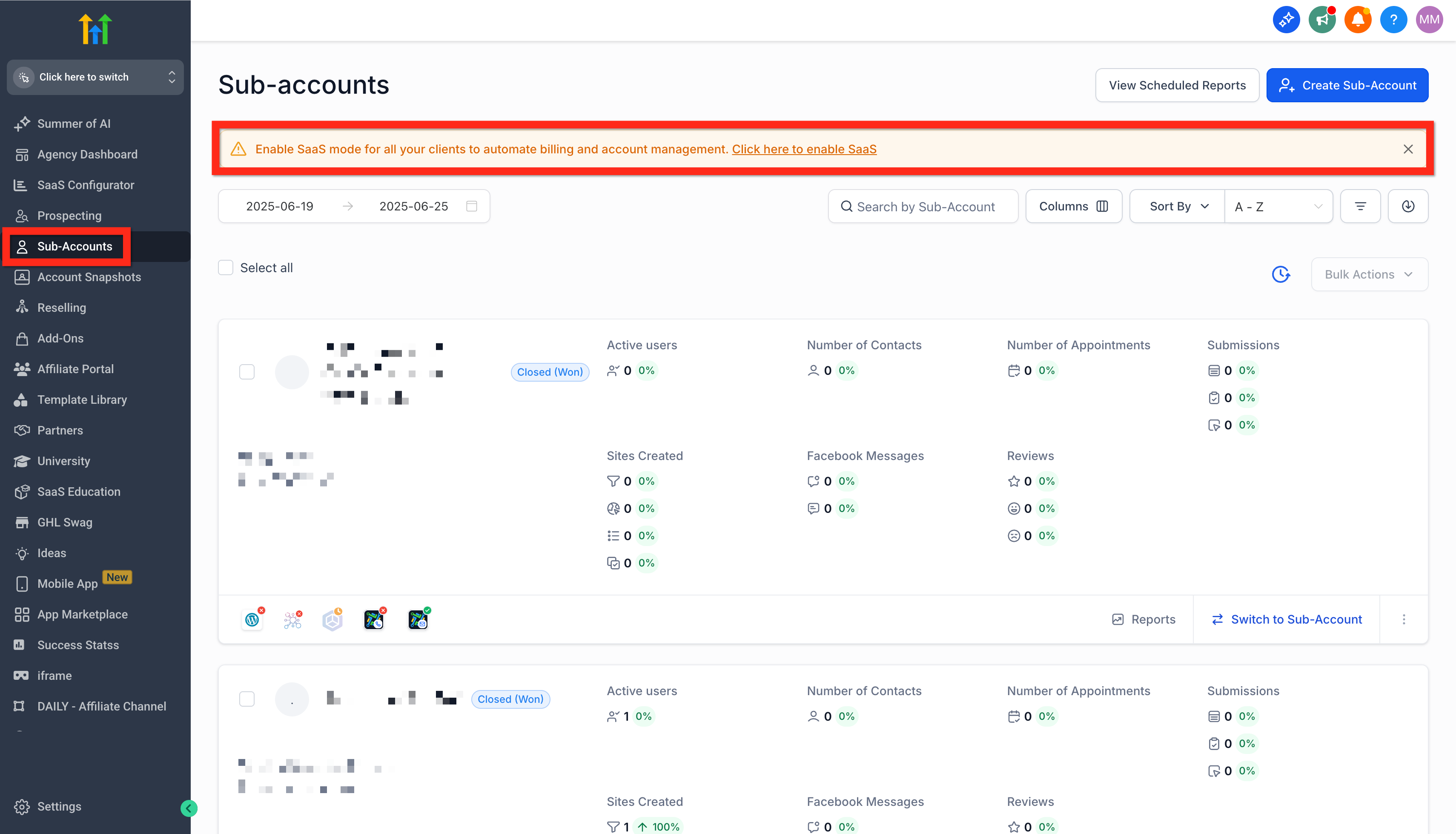 On your Agency Account > Sub-accounts page, if the conditions are met, you will see the prompt in yellow. Click the words "Click here to enable SaaS".