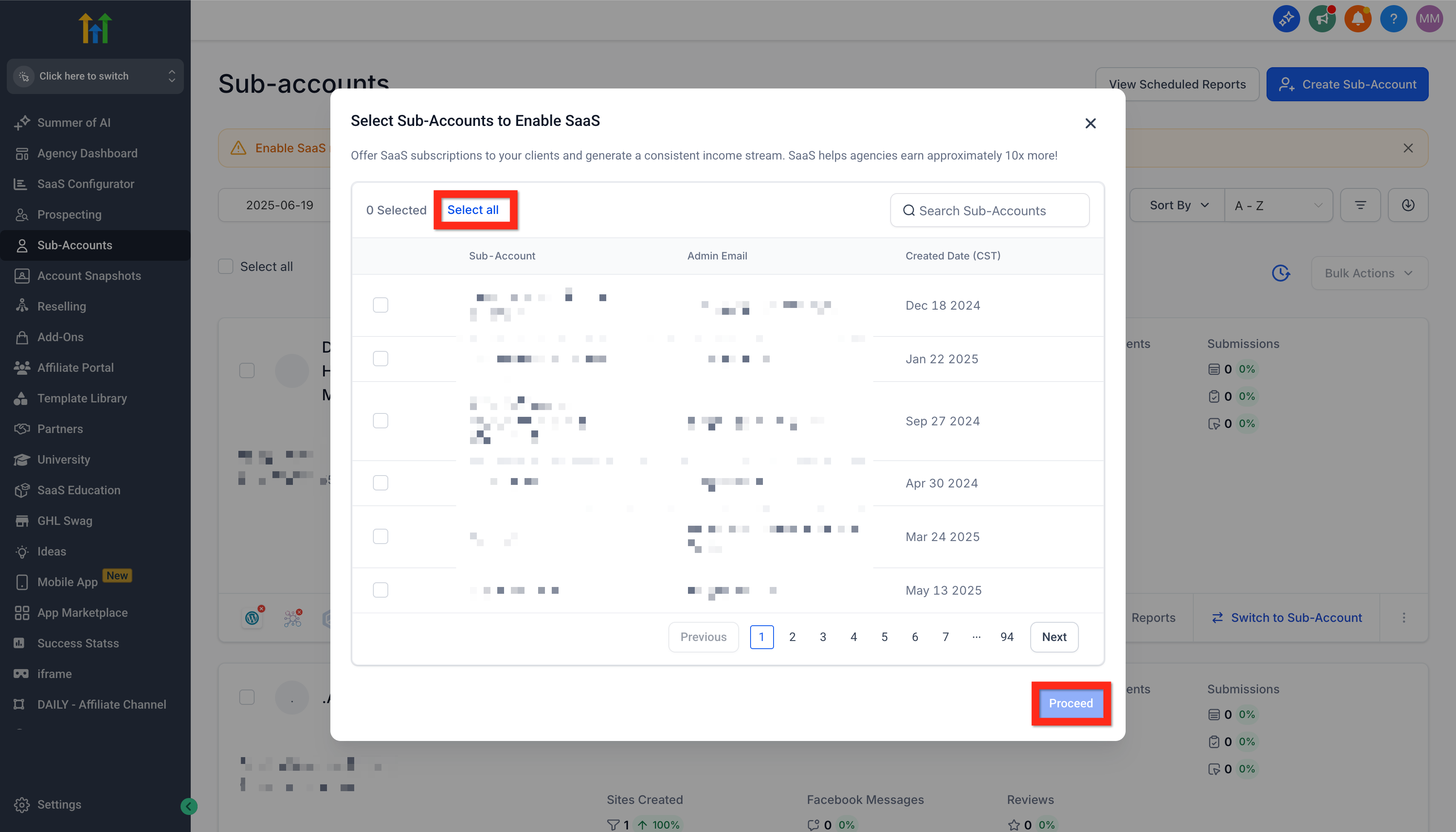 In the modal titled "Select Sub-Accounts to Enable SaaS" check the Sub-Accounts you want (or click Select All) and then click Proceed.