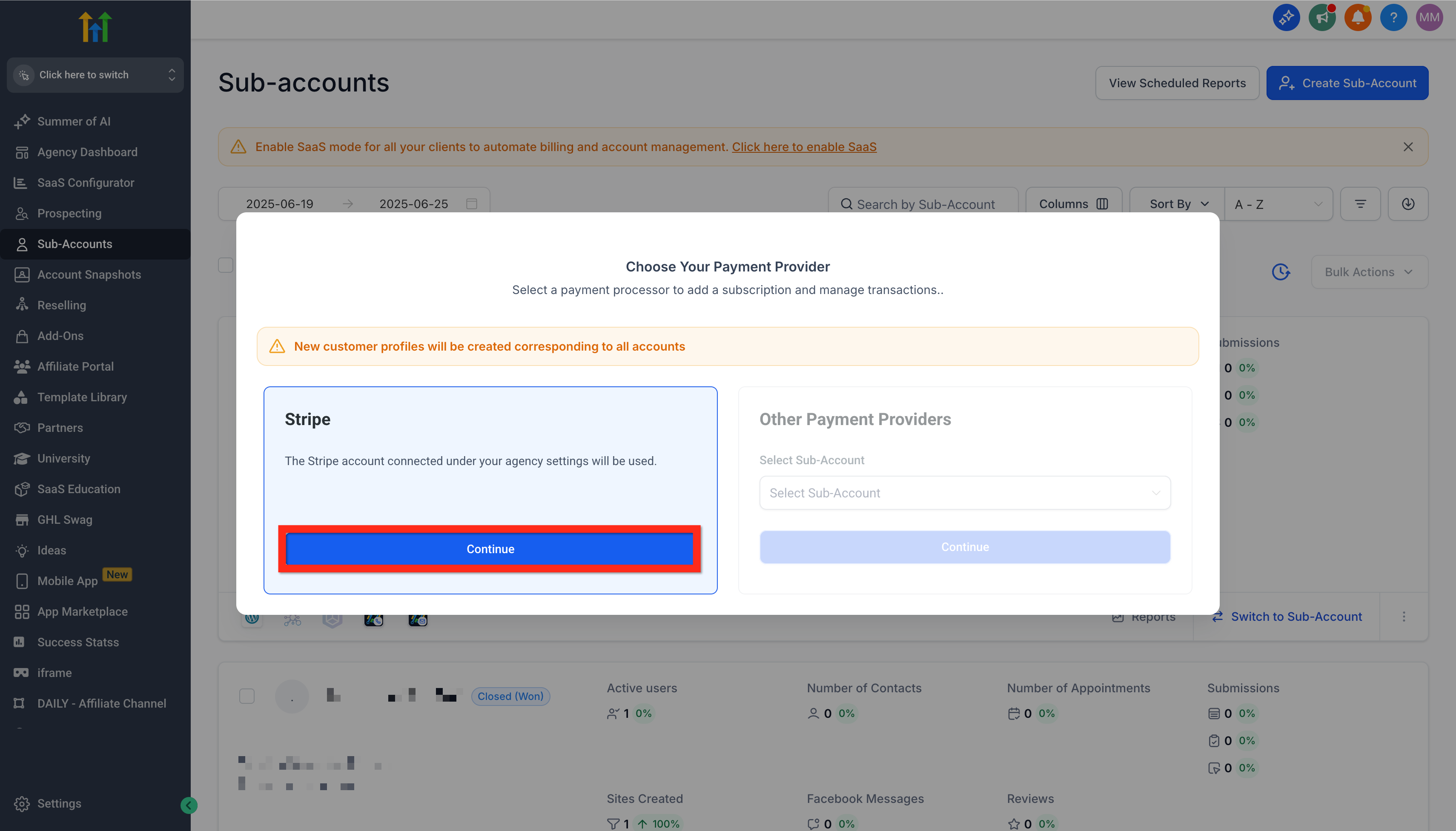 On the new modal titled "Select Subscription Plan" choose the payment frequency (month, year) and the SaaS plan to activate for all Sub-accounts. This will not start the process yet.