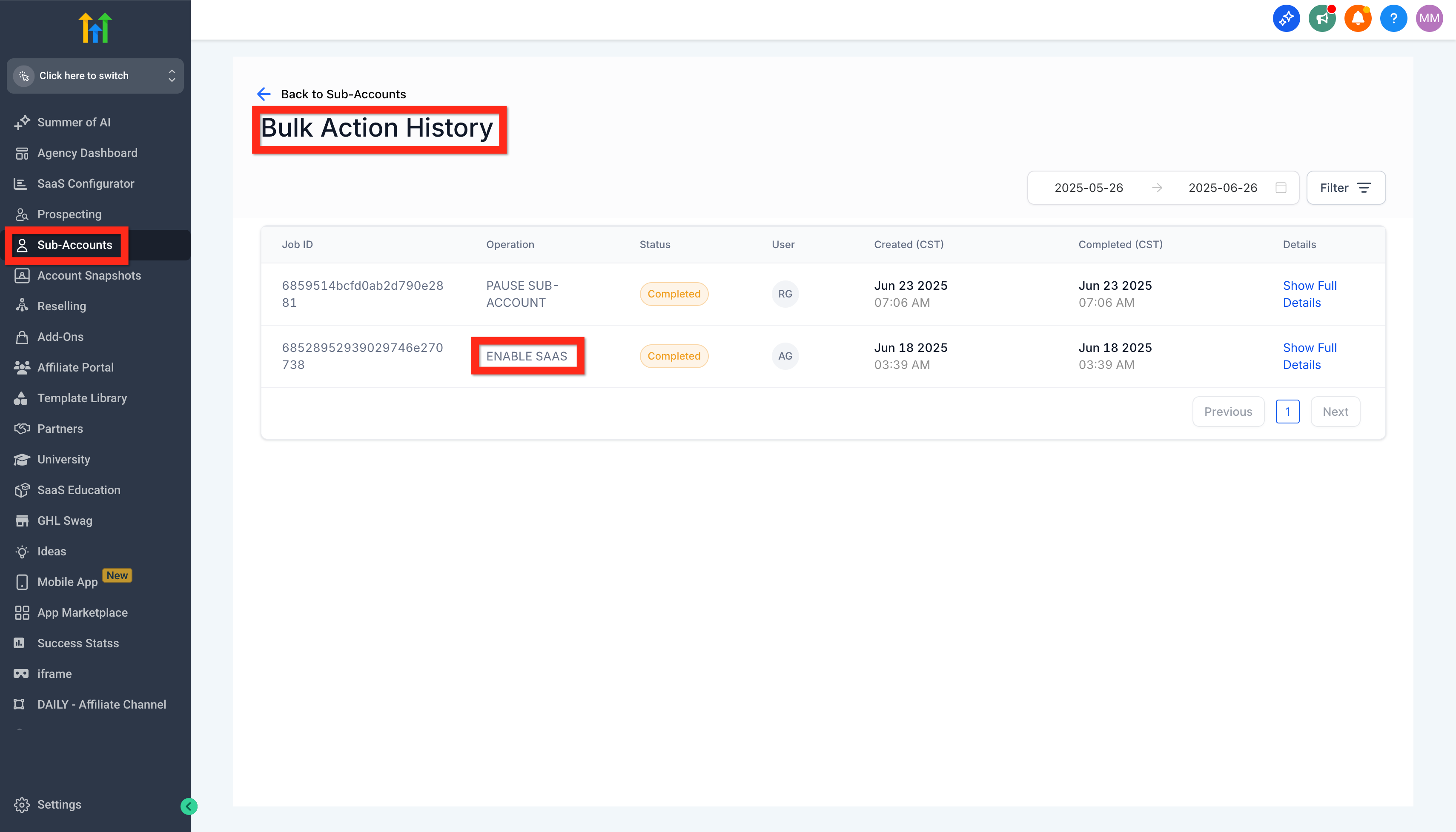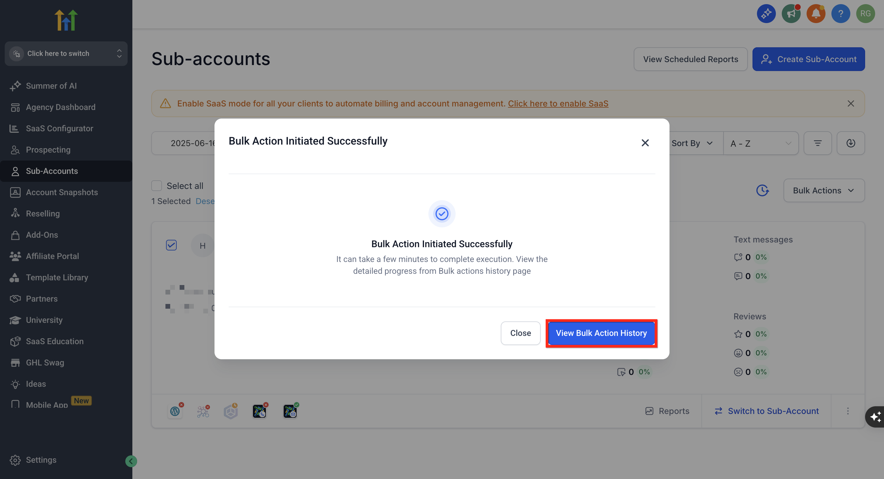 When the modal is closed, at any time, you can navigate to Agency Account > Sub-Accounts > Bulk Action History (clock icon).