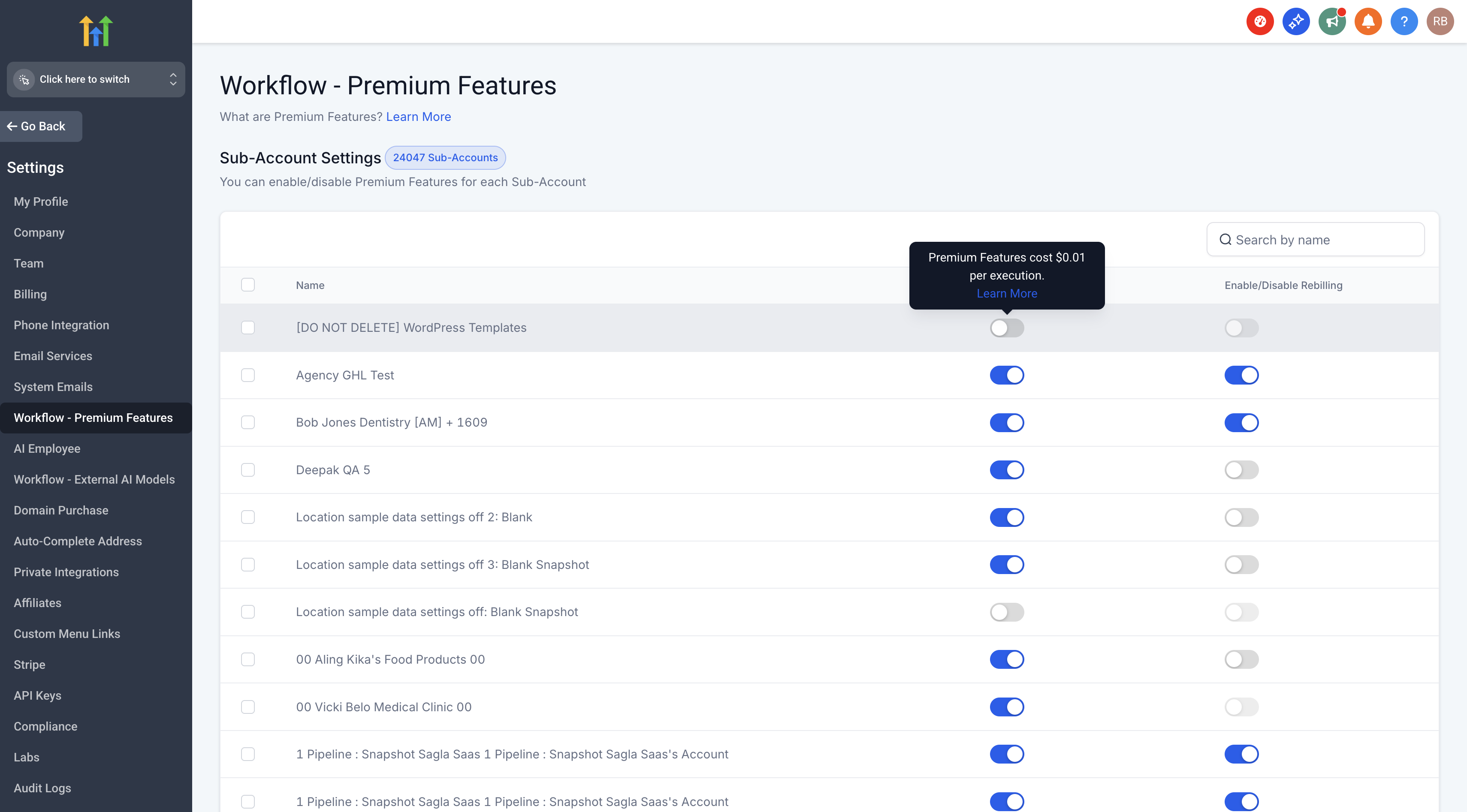 - You can enable or disable the Premium Features feature or rebill for each Sub-Account in Agency Settings > Workflows - Premium Features You can access Sub-Account Settings only if Premium Features are enabled at the Agency Level.