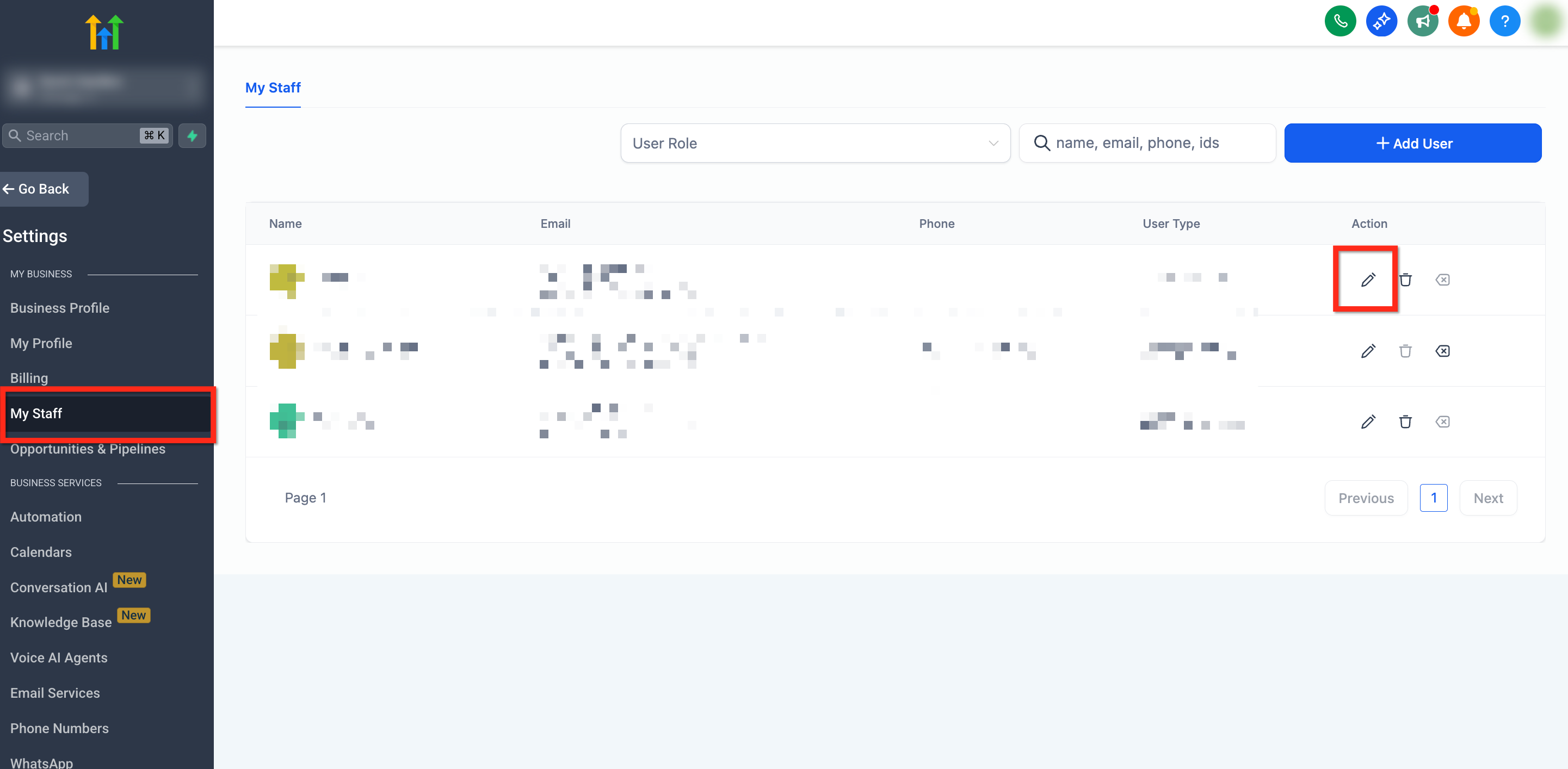 - Locate the staff member you’d like to update and click the Edit (Pencil) icon