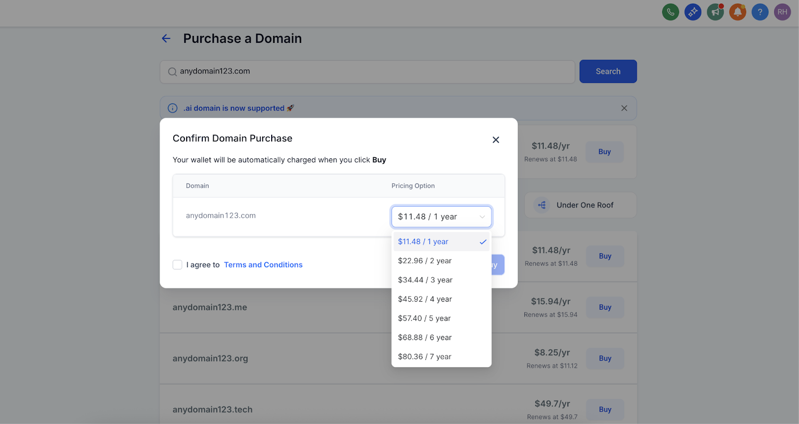 Once you've found your desired domain, click the Buy button next to it.Choose the registration period
