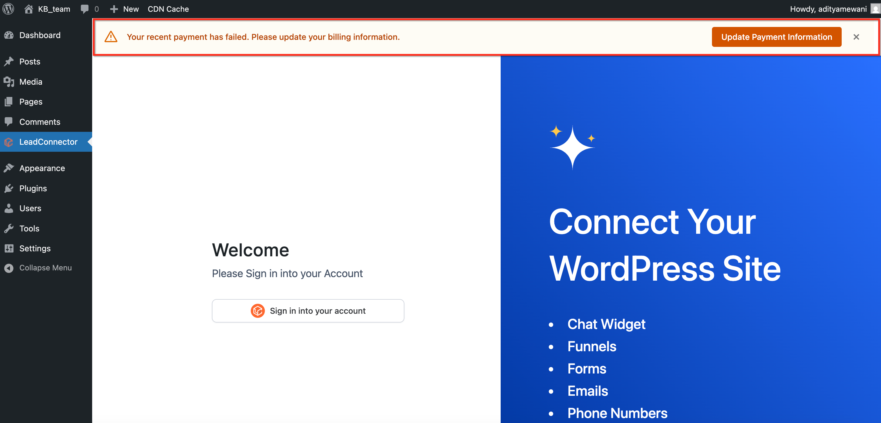 Payment Failure Notifications on WordPress Admin is a HighLevel feature that displays clear, contextual alerts in your WordPress Admin dashboard whenever a payment fails. Using the LC Plugin, it delivers real-time prompts that guide you toward resolving billing issues quickly, without leaving your primary work environment.