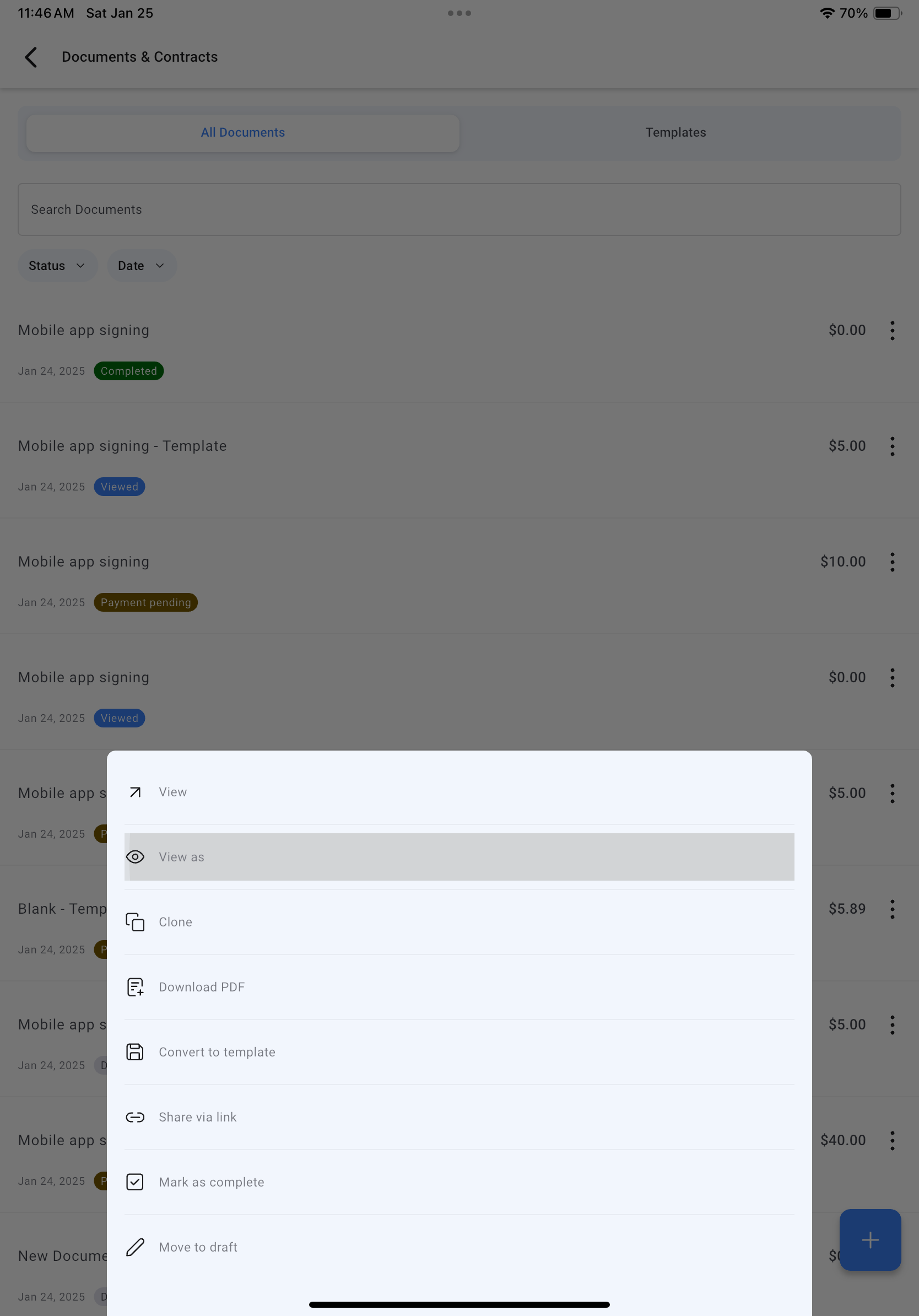- Create a New Document - Tap to create a document using a saved template that includes one or more signature fields.