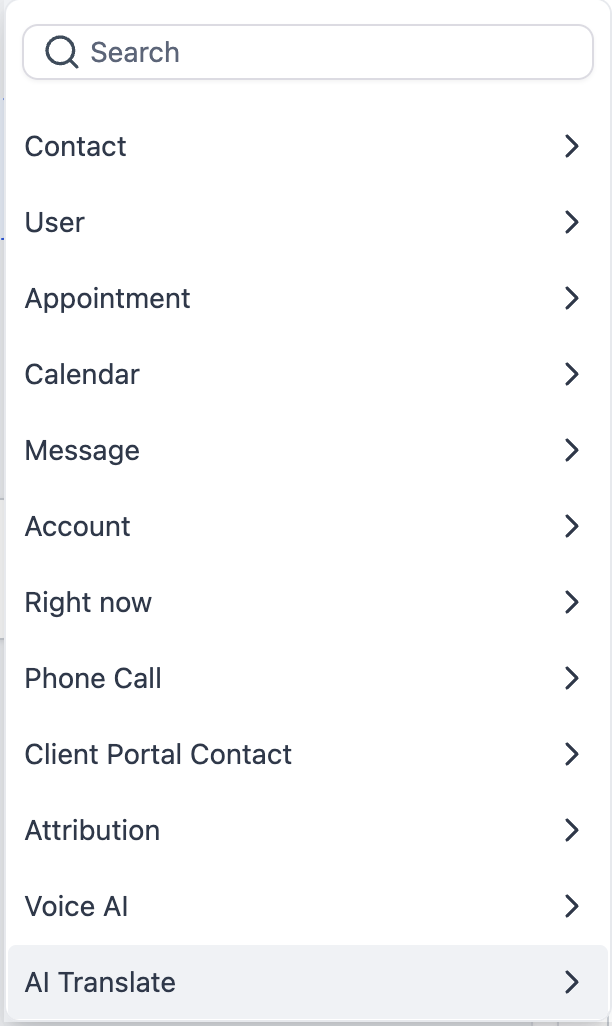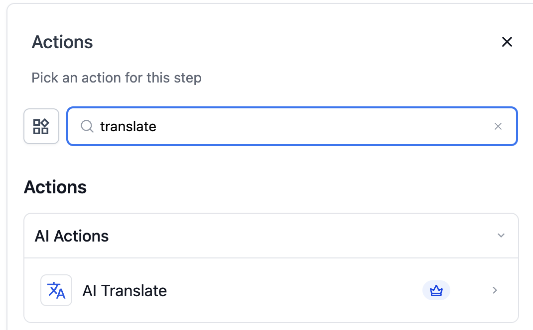 Navigate to your workflow builder and search for "Translate" in the actions menu. Add it to your workflow at the point where you want to translate content.
