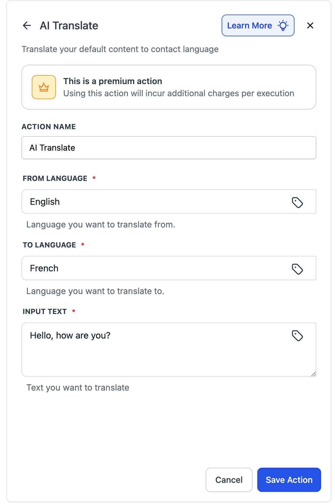 This article will guide you through using the AI Translate action in your workflows. You'll learn how to automatically translate text from a source language to a target language, making it easier to personalize communication for a global audience.