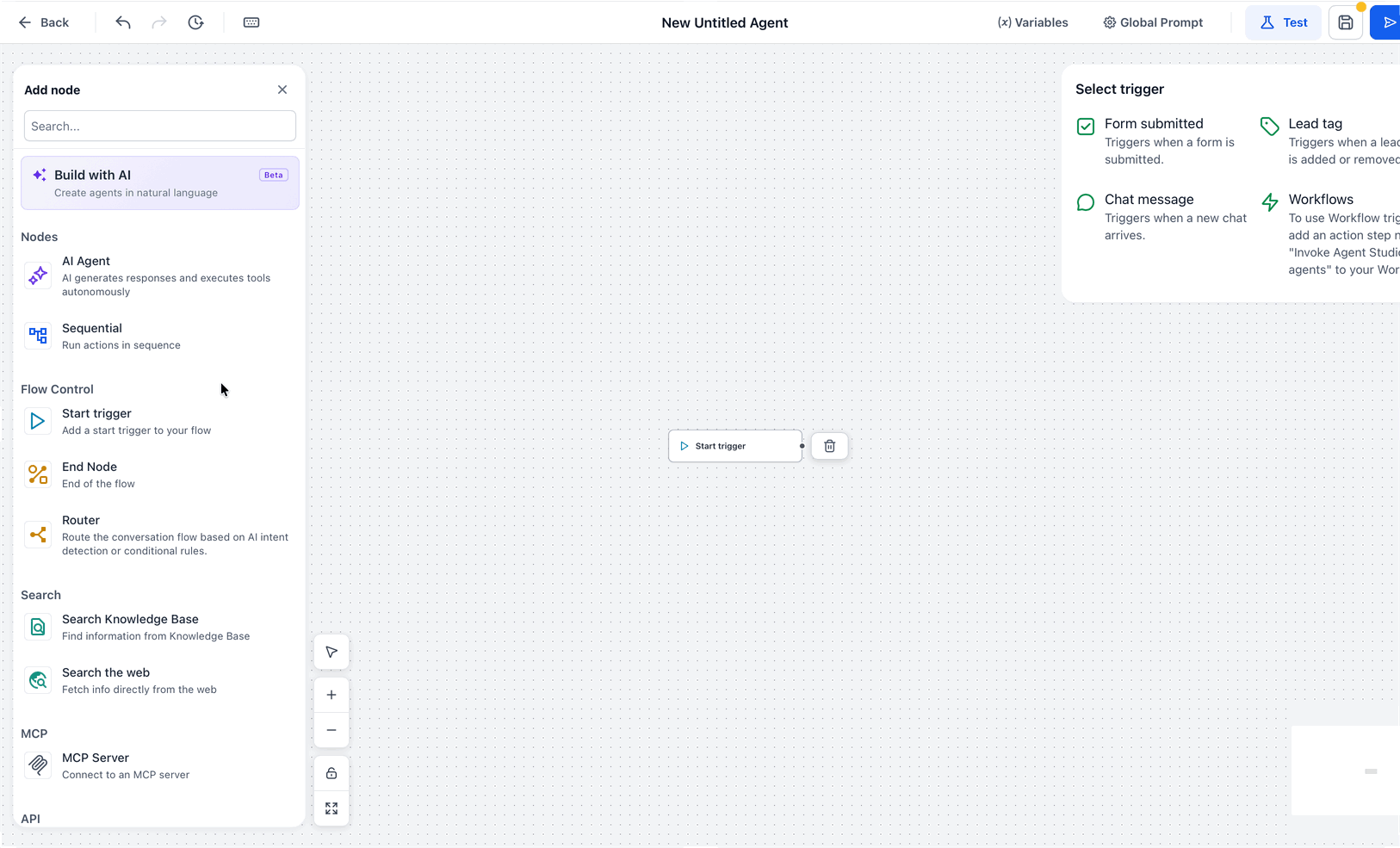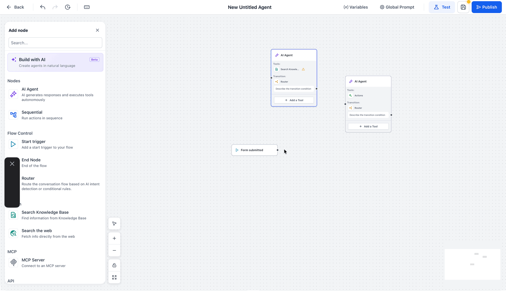 The drag-and-drop builder provides a visual way to create and manage your AI agent workflows. By connecting nodes and setting flow conditions, you can design complex processes with ease.