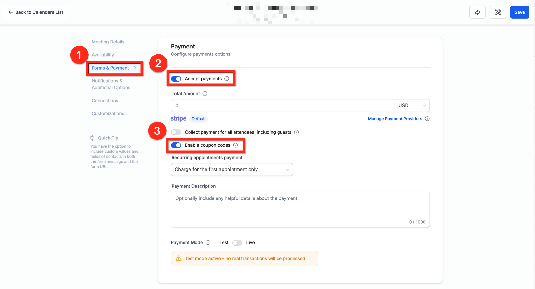 Step 1: Enable 'Accept Payments' and 'Coupon Codes' in Calendar
