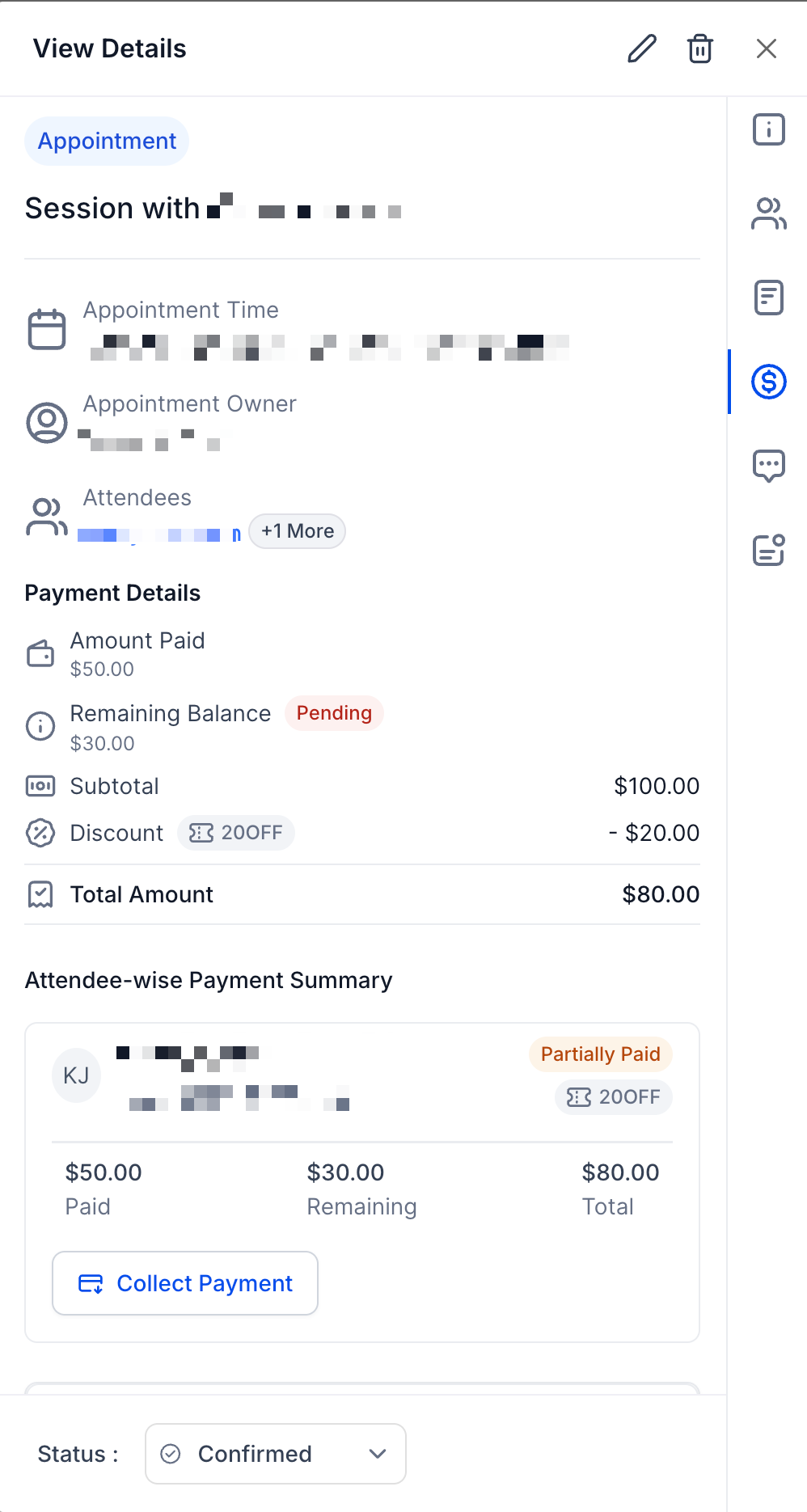 Open the appointment and check the Payments tab. You’ll see Discount (Coupon), Amount Paid, and Remaining Balance totals.
